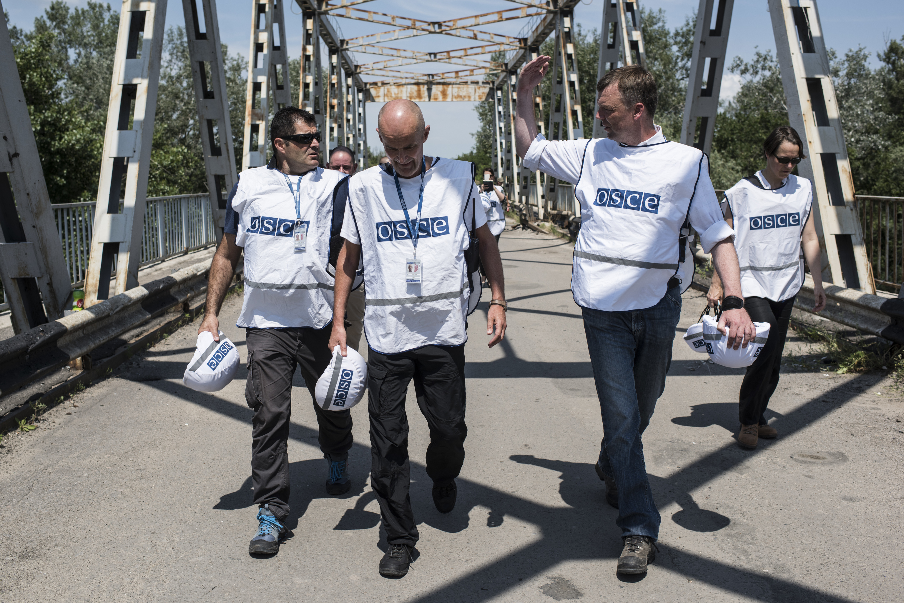 Alexander Hug (second right), Deputy Chief Monitor of the OSCE Special Monitoring Mission to Ukraine assessing the situation at bridges in Luhansk region, 6 July 2015.