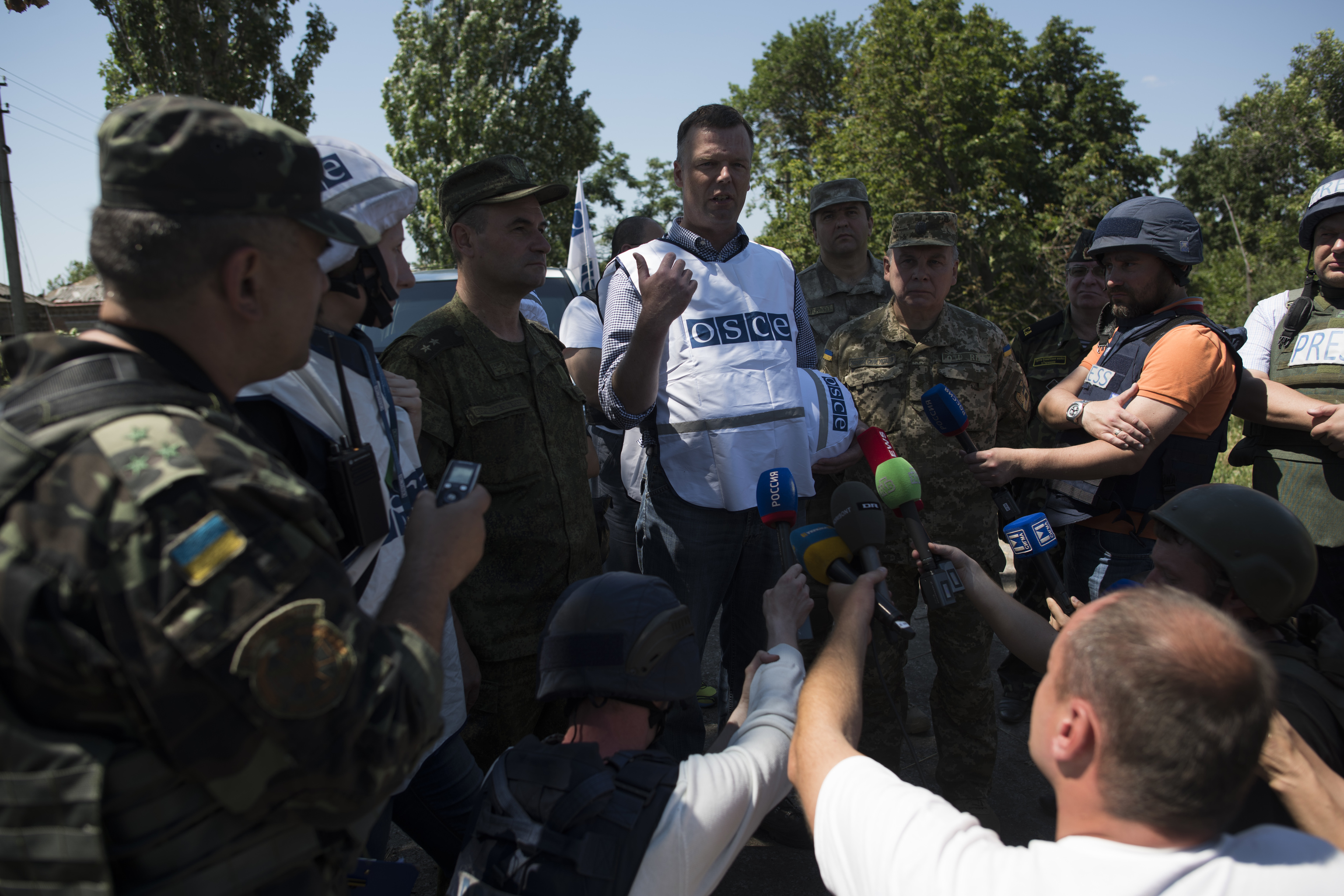Deputy Chief Monitor of the OSCE Special Mission to Ukraine, Alexander Hug, talking to the press in Shyrokyne, 4 July 2015.