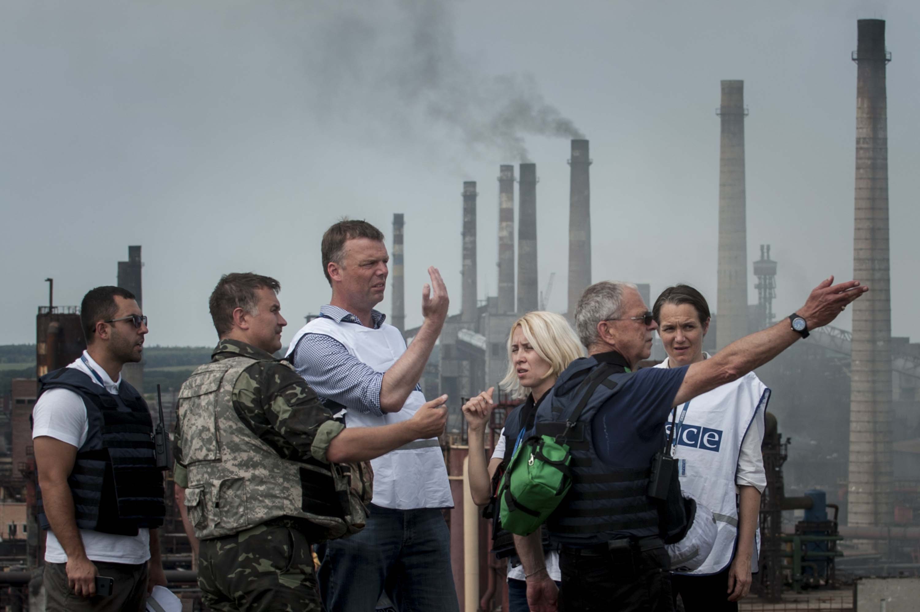 Monitors of the OSCE Special Monitoring Mission to Ukraine together with a member of the Joint Centre for Control and Co-ordination assessing the situation at the chemical plant in Avdiivka, which was damaged during a recent shelling, Donetsk, 5 July 2015