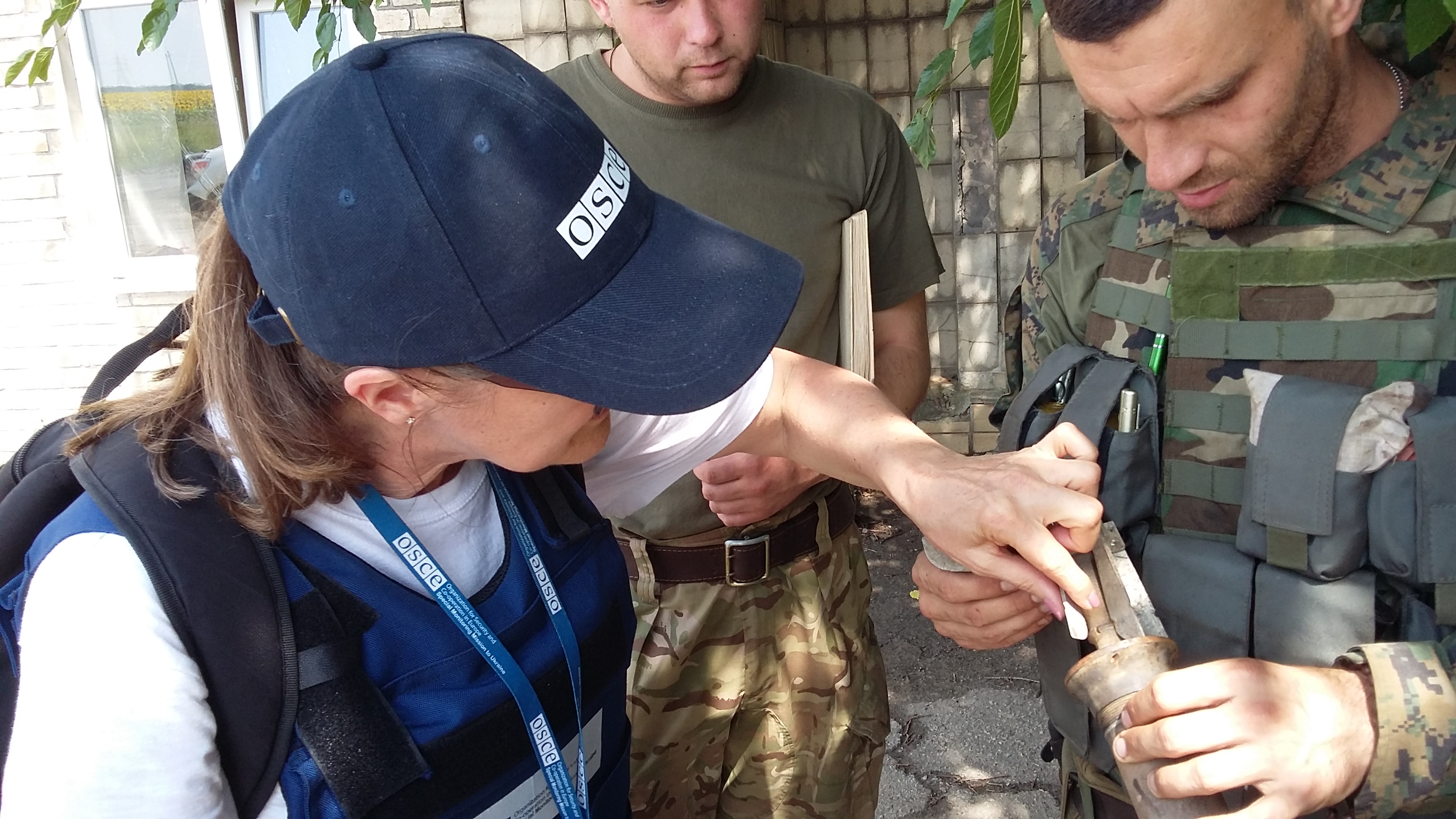 Sylvia L. Schaer Hahn, from the OSCE Special Monitoring Mission to Ukraine, inspecting military remnants in Kurdiumivka, 29 July 2015.