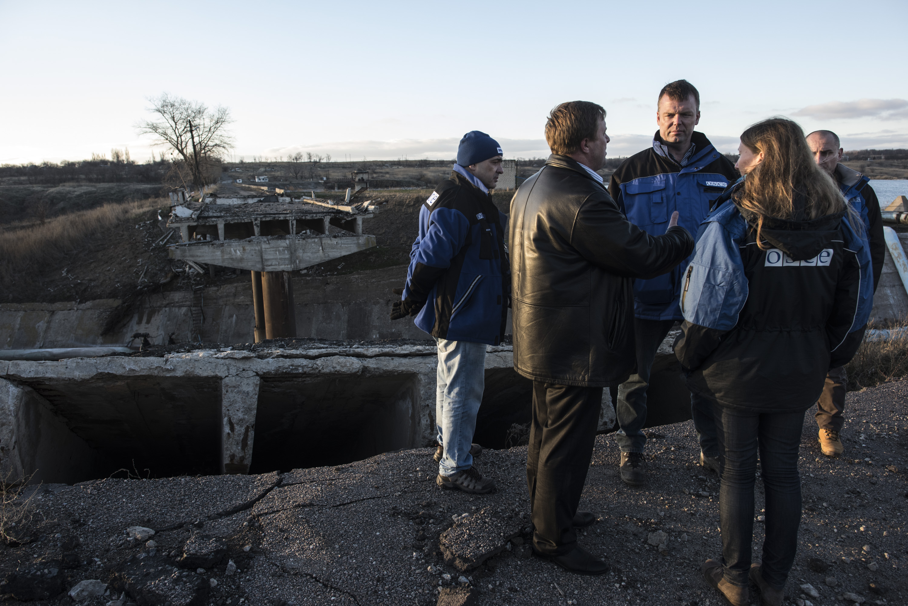SMM monitors near the destroyed bridge in Pavlopil, 8 December 2015.