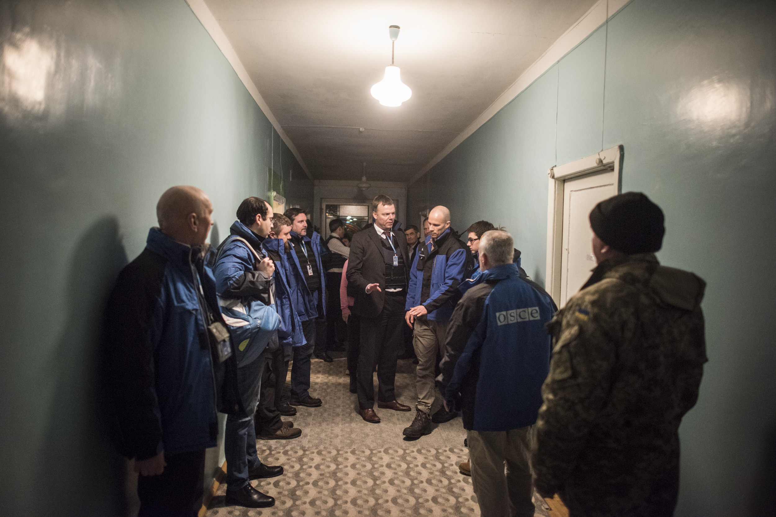OSCE SMM Principal Deputy Chief Monitor Alexander Hug meeting with SMM members at the opening of the Mission's new Forward Patrol Base in Svitlodarsk, 14 January 2016.