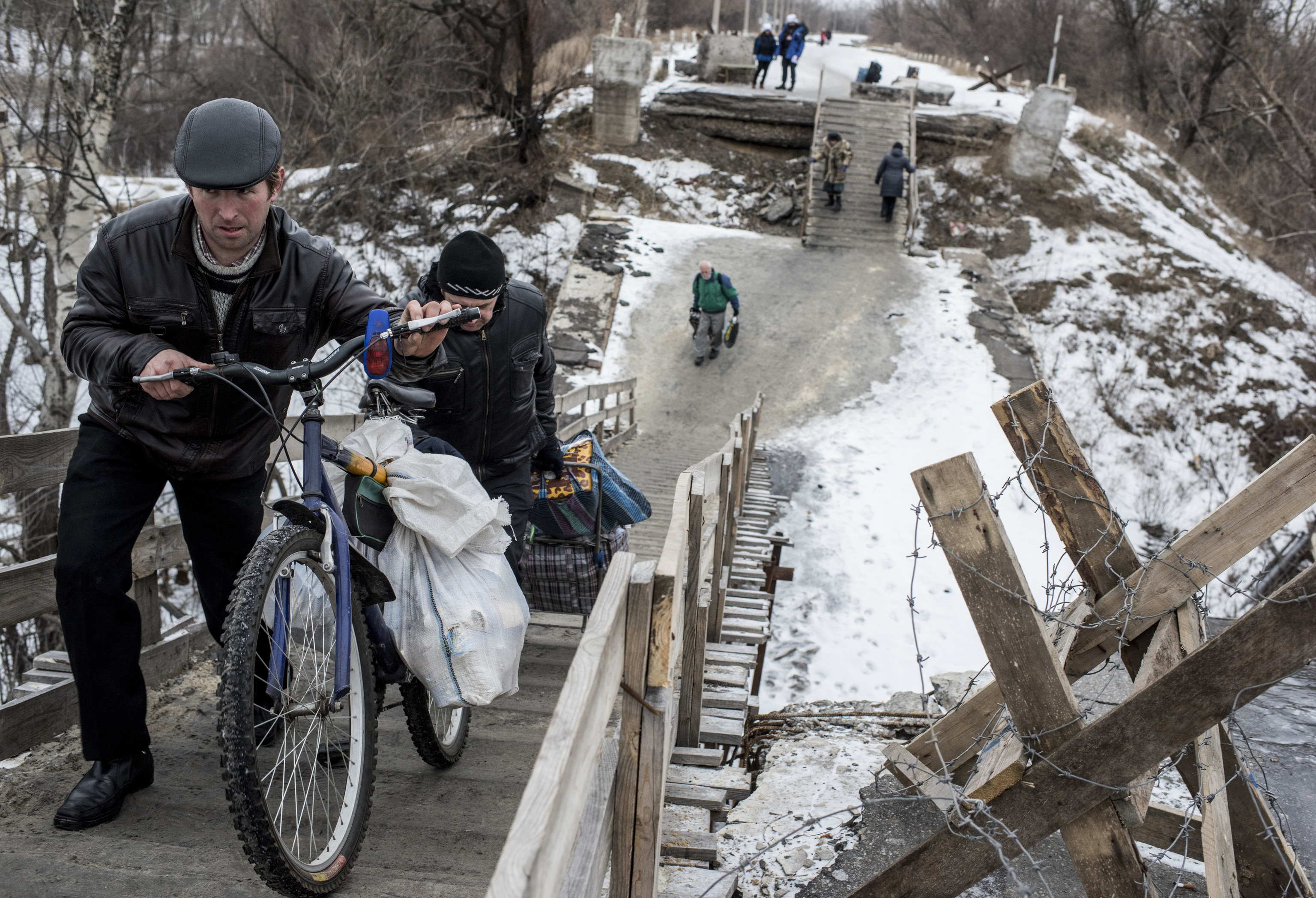 Civilians crossing a bridge in Stanystia Luhanska, 16 January 2016.