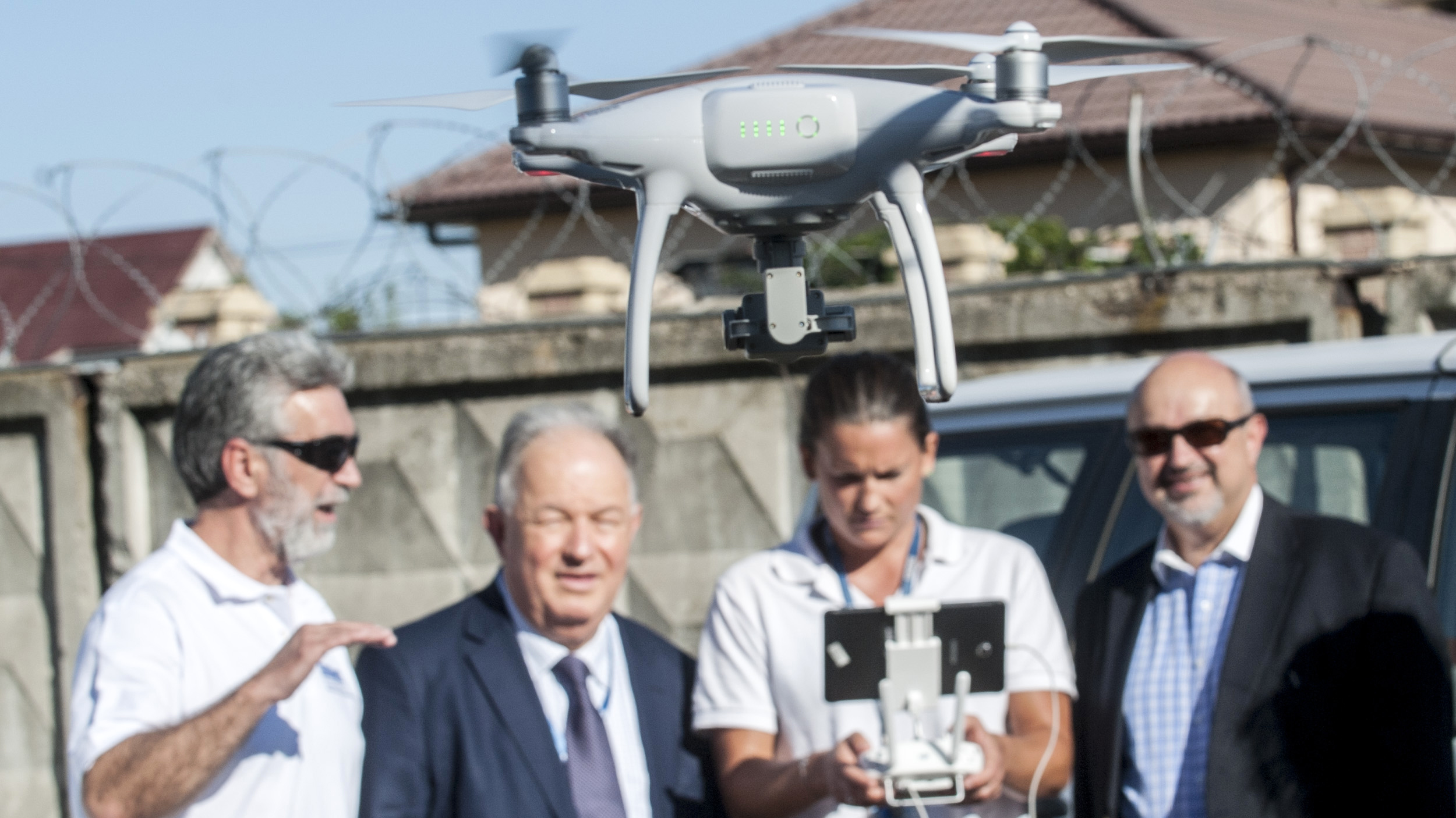 Monitoring Officer Maria Torelm demonstrates how to fly an SMM UAV during a site visit by Ambassador Lamberto Zannier, OSCE Secretary General, and OSCE SMM Chief Monitor Ertugrul Apakan to the Special Monitoring Mission to Ukraine in Kramatorsk, Donetsk region, on 8 September 2016.