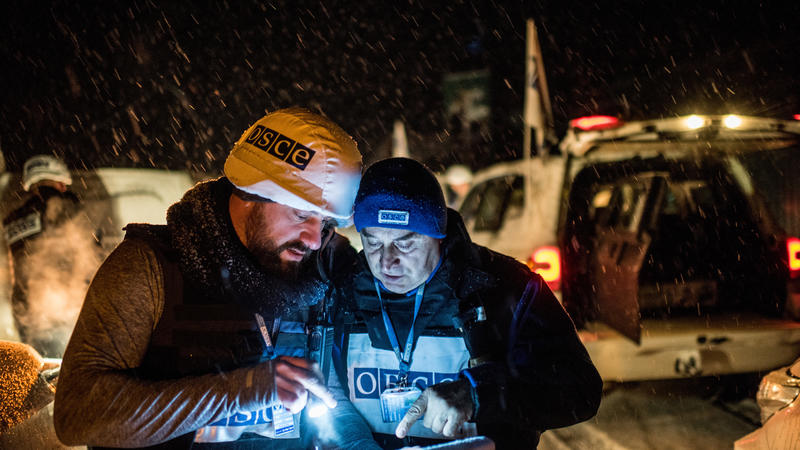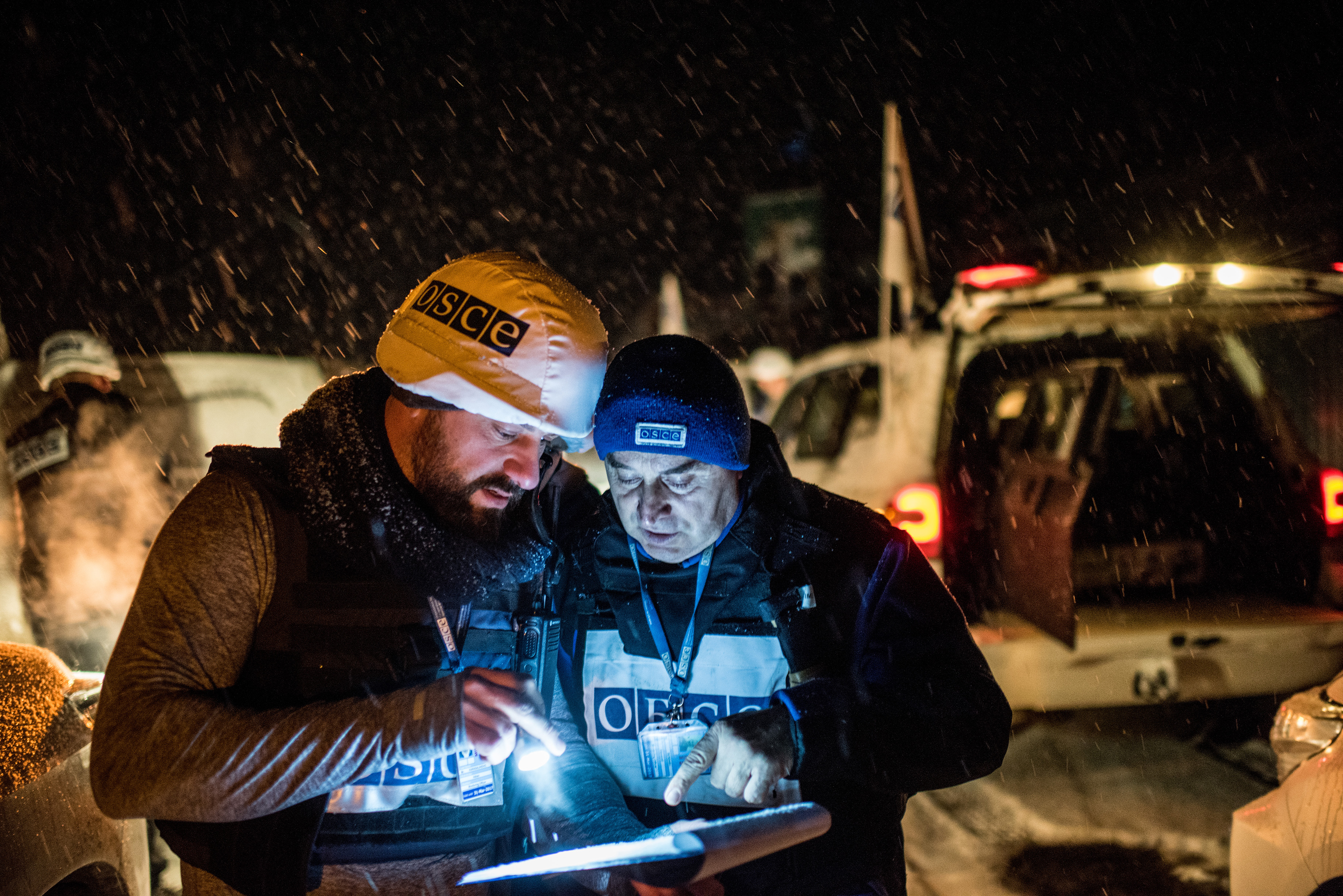 Monitors from the OSCE Special Monitoring Mission to Ukraine working at night, 15 December 2016.