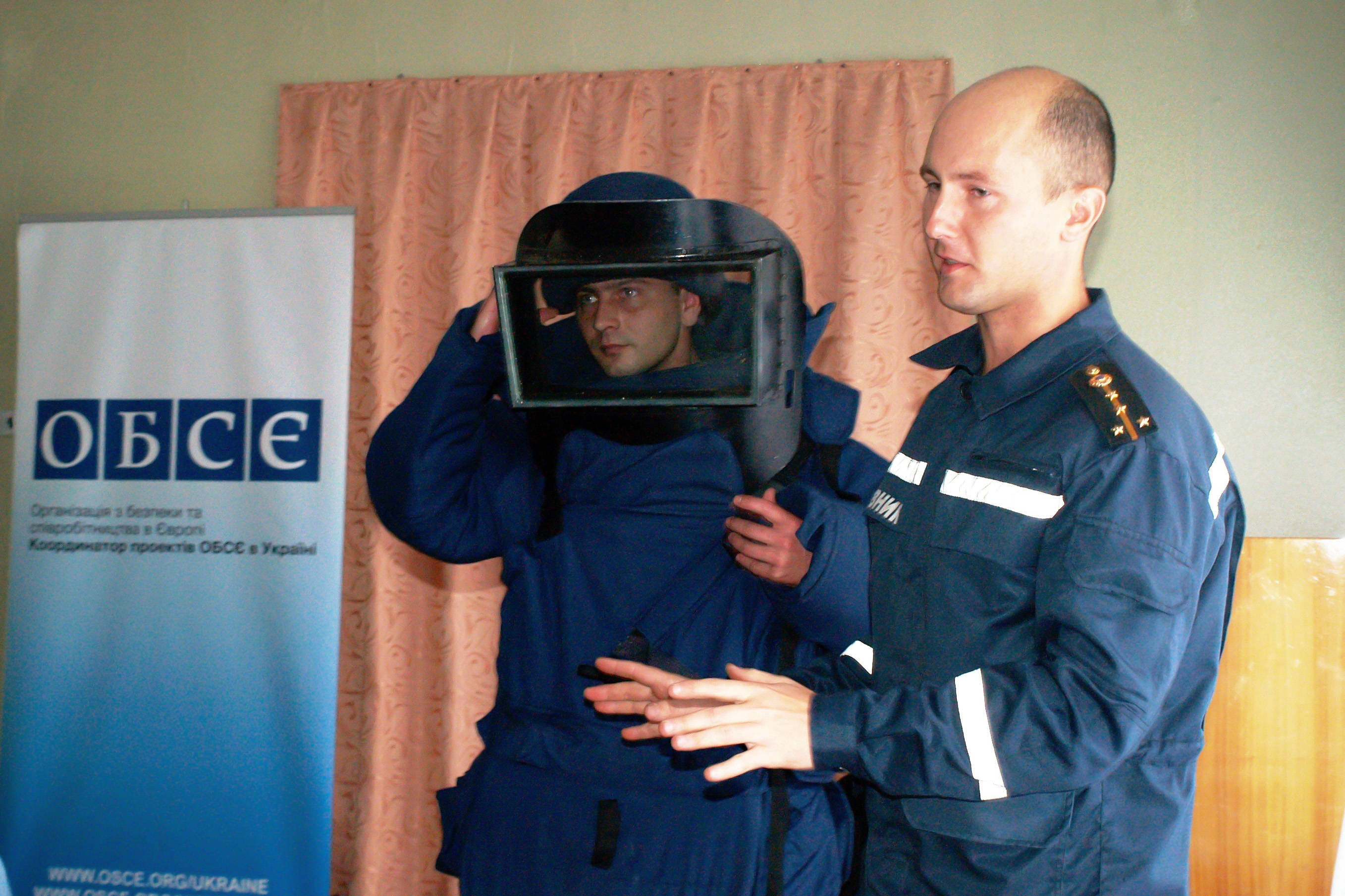 Roman Abramov, a pyrotechnic team leader of the Poltava Regional Emergency Department, teaches children about the dangers of unexploded weapons during an awareness-raising exercise conducted with OSCE support on 24 October 2013 in a school of Velyka Bahachka village in Poltava region, central Ukraine.