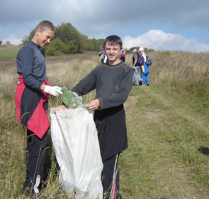 Schoolchildren collect garbage on a hiking trail in the Transcarpathian region, as part of an environmental awareness campaign by the OSCE Project Co-ordinator in Ukraine, July 2007.