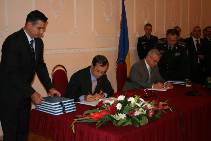 OSCE Secretary General Marc Perrin de Brichambaut (left) and Ukraine's acting Minister of Defence Valeriy Ivashchenko sign a contract for the disposal of the toxic rocket fuel component melange, Kyiv, 16 September 2009.