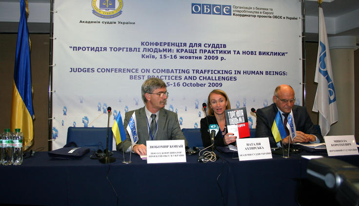 (L-r) Lubomir Kopaj, OSCE Project Co-ordinator in Ukraine, Natalia Akhtirska of the Academy of Judges of Ukraine and Mykola Korotkevich of the Supreme Court of Ukraine talk to journalists, Kyiv, 15 October.