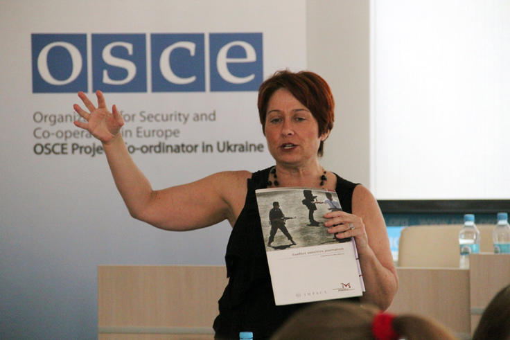 Michelle Betz, a media trainer from Canada, talks of responsible journalism in a conflict area at a training course organised by the OSCE Project Co-ordinator in Ukraine, Kyiv, 11 September 2014.