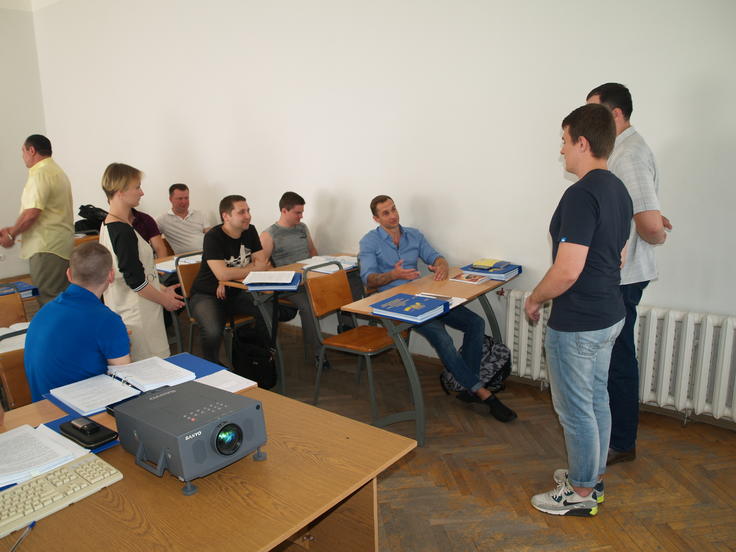 Role play was an important part of the training with participants of the Kyiv workshop re-enacting a response to a call from a fictitious victim of domestic violence, Kyiv, 3 June 2015.