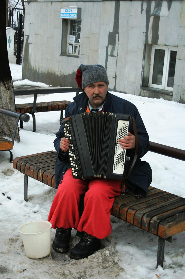A street busker in traditional costume on Andriyivsky Uzviz, Kyiv, February 2006.
