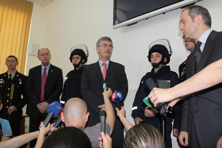 The OSCE Project Co-ordinator in Ukraine, Ambassador Lubomir Kopaj (c) and Emergency Situations Minister Nestor Shufrich (r) talk to journalists after a ceremony to hand over explosive ordnance detection equipment in Kyiv, 10 June 2010.