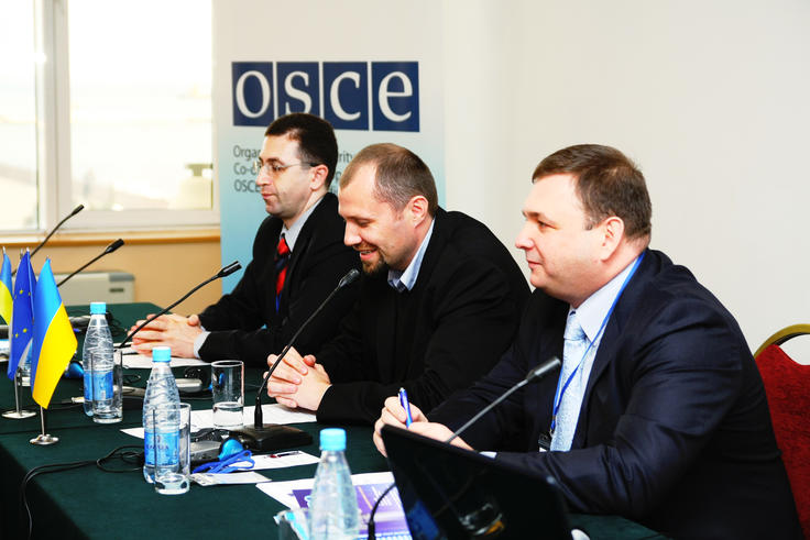 L-r: Stanislav Shevchuk, OSCE PCU National Legal Adviser; Denys Kobzin, Director of the Kharkiv Institute of Social Research; Artashes Melikyan of the Council of Europe's Human Rights and Legal Affairs DG, at a press conference in Odessa, 2 November 2010.