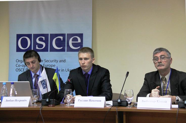 L-r: Ljuban Petrovic, Cybercrime Investigator, Serbian Ministry of Interior; Ruslan Pakhomov, Head of Division for Combating Cybercrime, Department for Combating Cybercrime and Trafficking in Human Beings, Ministry of Interior of Ukraine, and Ambassador Lubomir Kopaj, OSCE Project Co-ordinator in Ukraine, at a press conference during a roundtable discussion on prosecuting cybercrime in Ukraine, Kyiv, 25 October 2011.