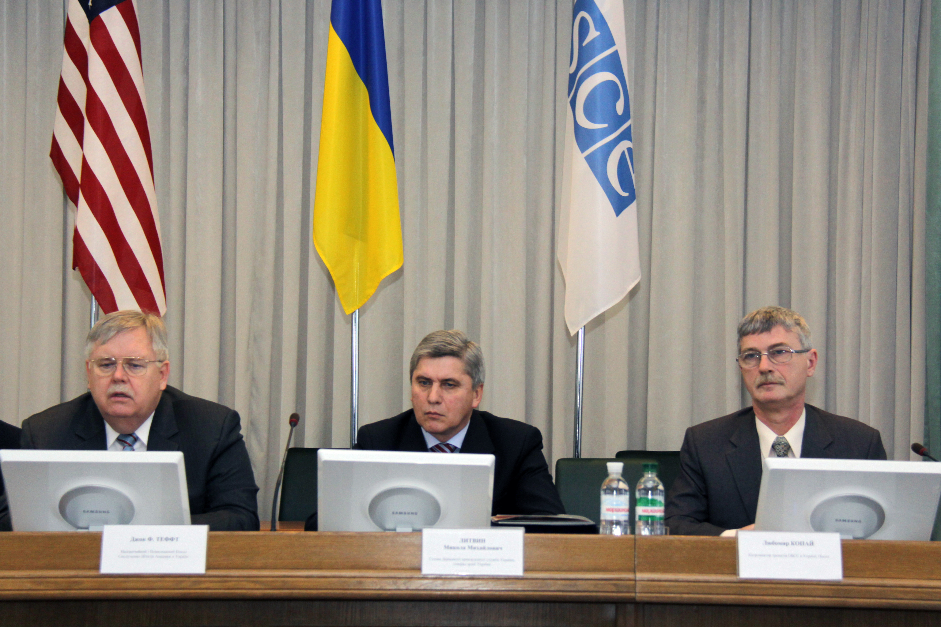 (L-R) John Tefft, U.S. Ambassador to Ukraine, Mykola Lytvyn, the Chairperson of the State Border Guard Service of Ukraine, and Ambassador Lubomir Kopaj, the OSCE Project Co-ordinator in Ukraine, at the official handover ceremony in Kyiv, 31 January 2012.