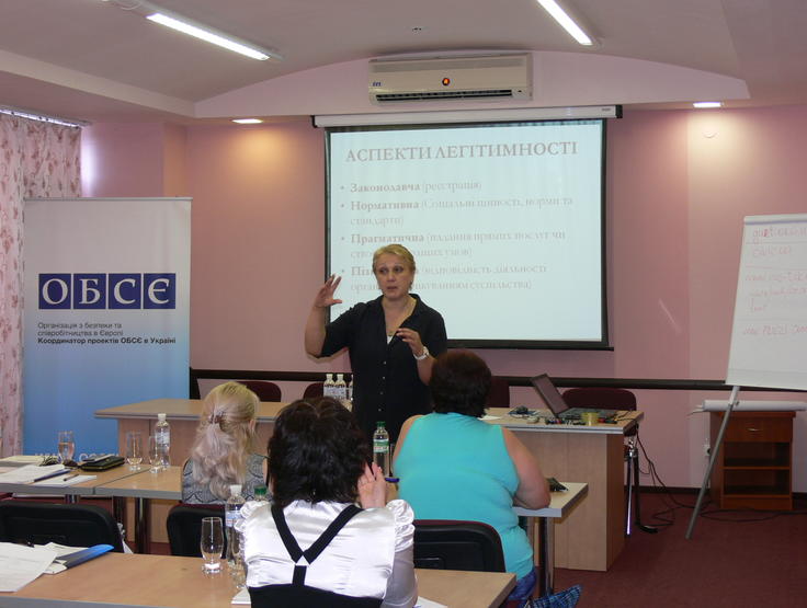 Lyubov Plaivoda, the President of the CCC Creative Centre NGO, discusses aspects of public reporting with NGO representatives during a training event supported by the OSCE Project Co-ordinator in Ukraine, Dnipropetrovsk, 2 July 2012.