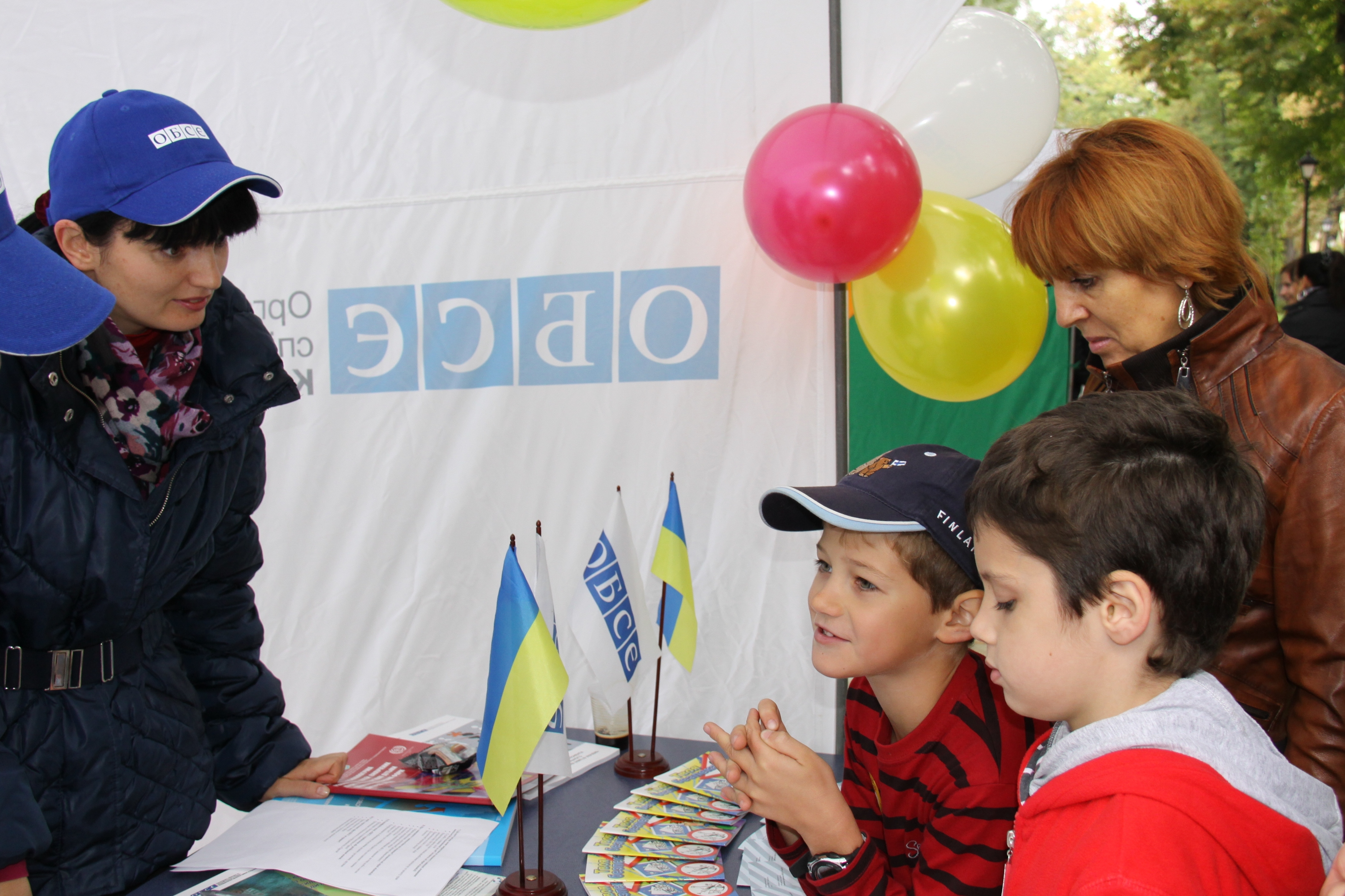 Tetyana Medun, Project Officer at the OSCE Project Co-ordinator in Ukraine, discusses anti-domestic violence issues with children participating in the quiz, Kyiv, 22 September 2012.