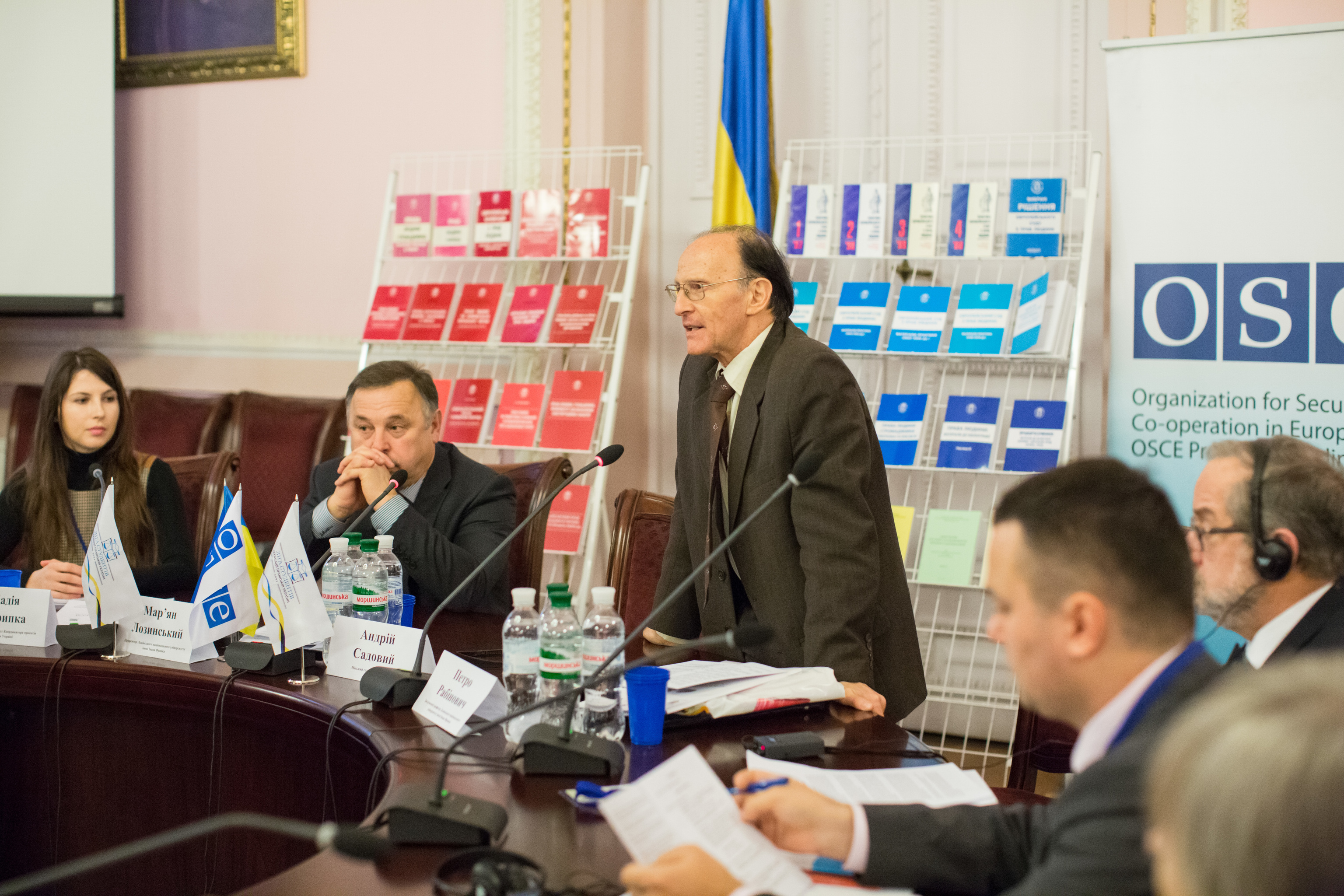 Professor Petro Rabinovych, the Head of the Human Rights Laboratory at the National Academy of Legal Science of Ukraine, speaks at an international forum on the case law of the European Court of Human Rights supported by the OSCE Project Co-ordinator in Ukraine, Lviv, 30 November 2012.