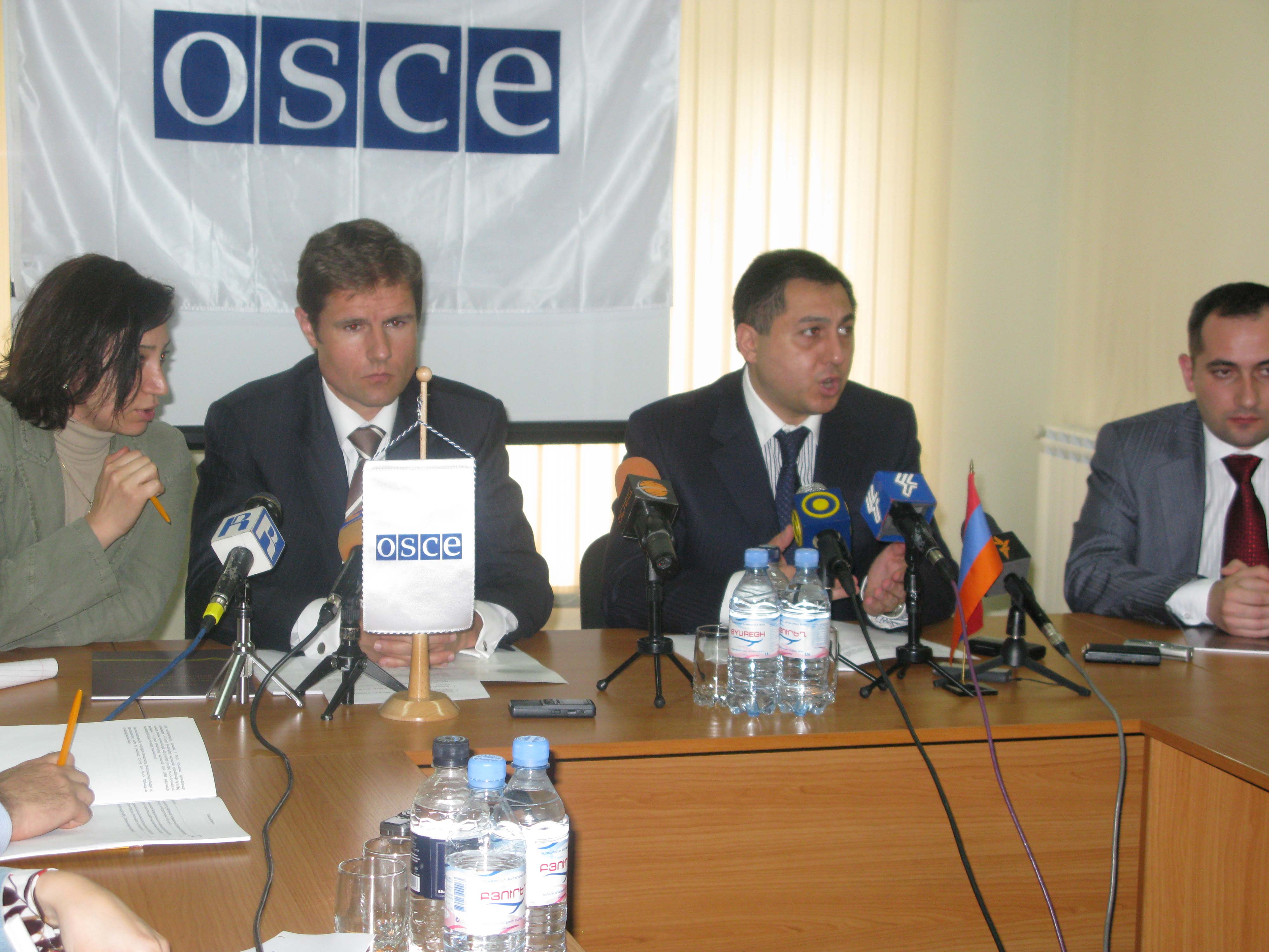 Carel Hofstra (c), Acting Head of the OSCE Office in Yerevan and Armen Harutyunyan (r), Human Rights Defender, present a report on human rights protection and disciplinary policy in the armed forces of Armenia, Yerevan, 27 May 2009.