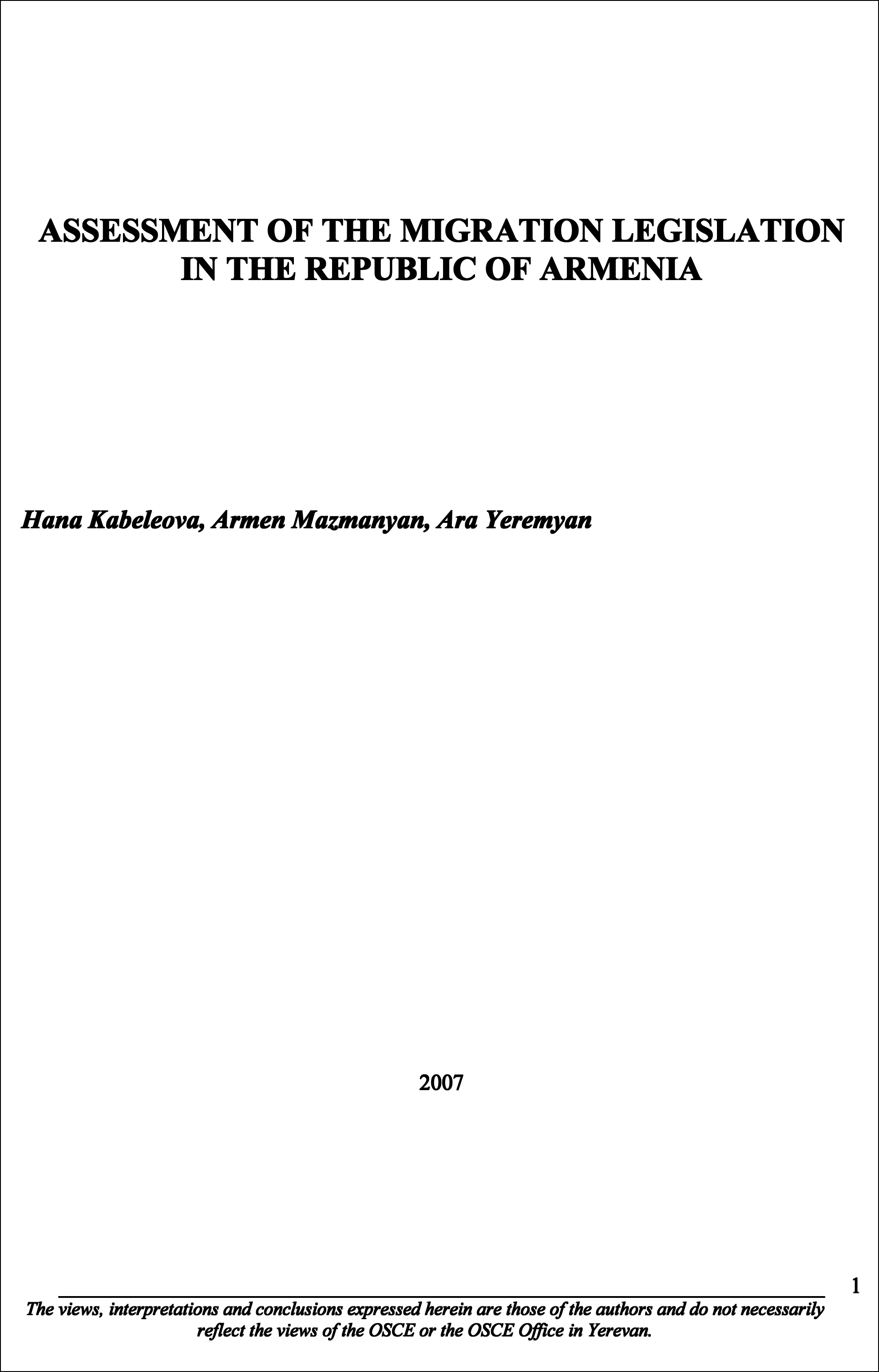 Cover to the assessment document of the migration legislation in the Republic of Armenia.