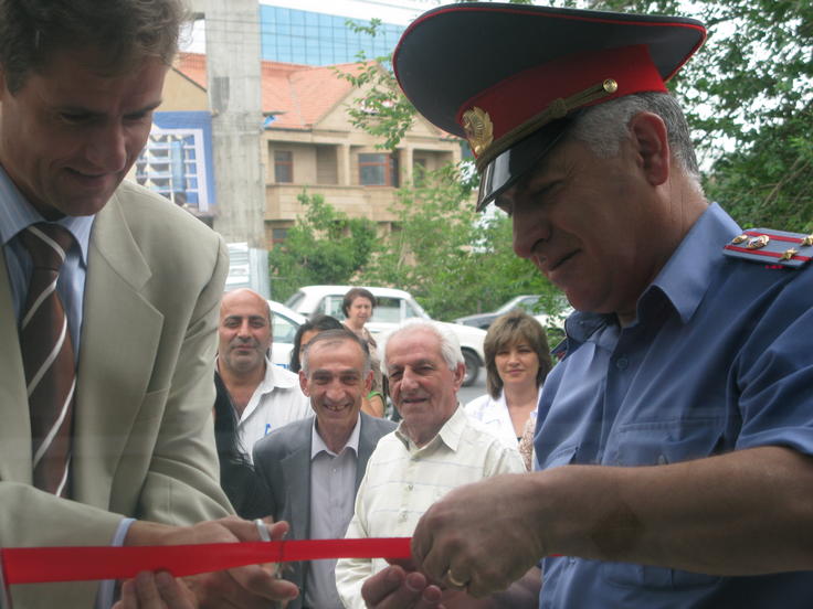 Deputy Head of the OSCE Office in Yerevan, Carel Hofstra (l) and Deputy Head of the Arabkir Police Department, Vladimir Avagimyan, at the opening of a police outreach station in Yerevan, Armenia, 19 June 2009.