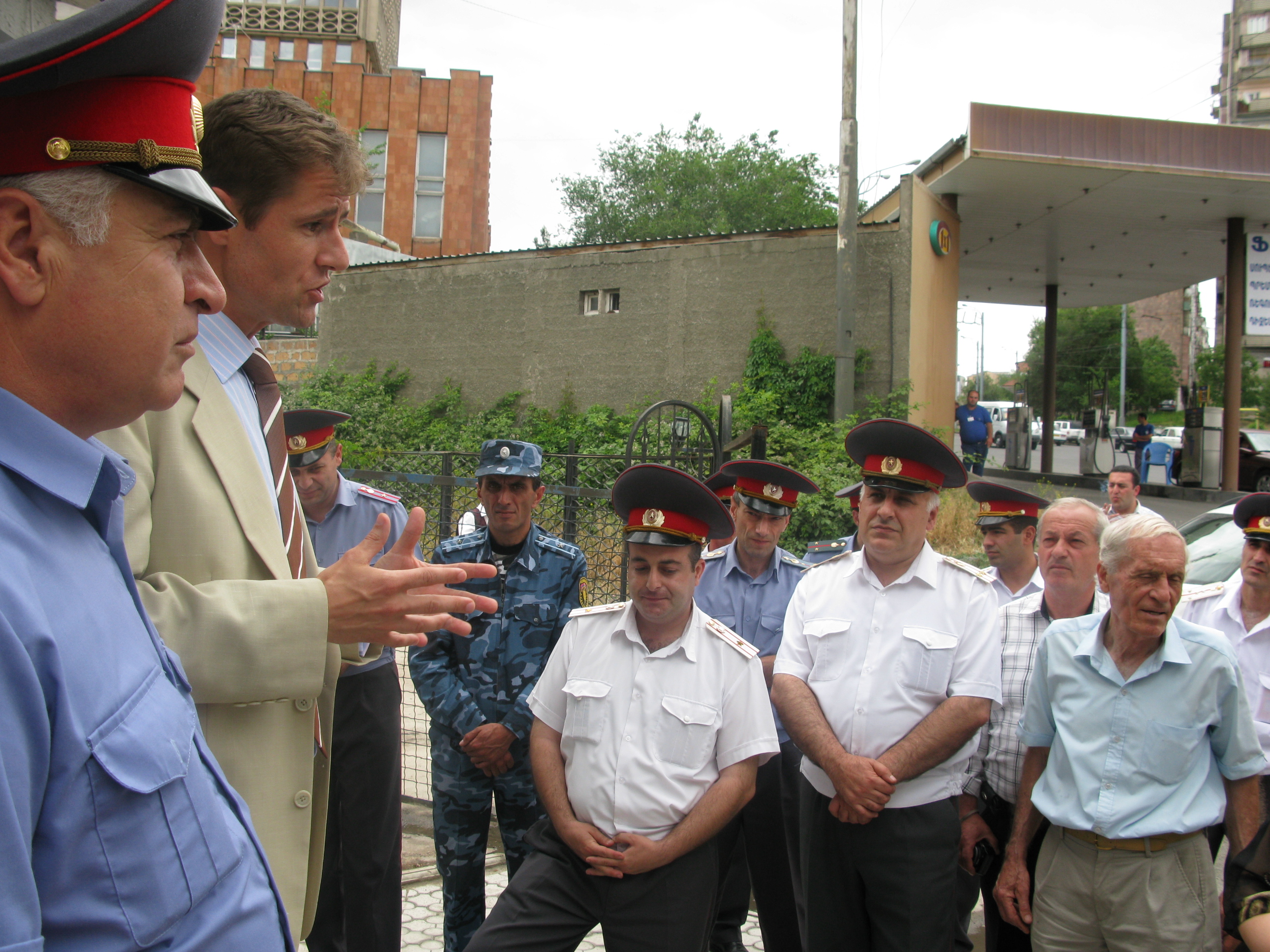 Deputy Head of the Arabkir Police Department, Vladimir Avagimyan (l) and Deputy Head of the OSCE Office in Yerevan, Carel Hofstra, at the opening of a police outreach station in Yerevan, Armenia, 19 June 2009.