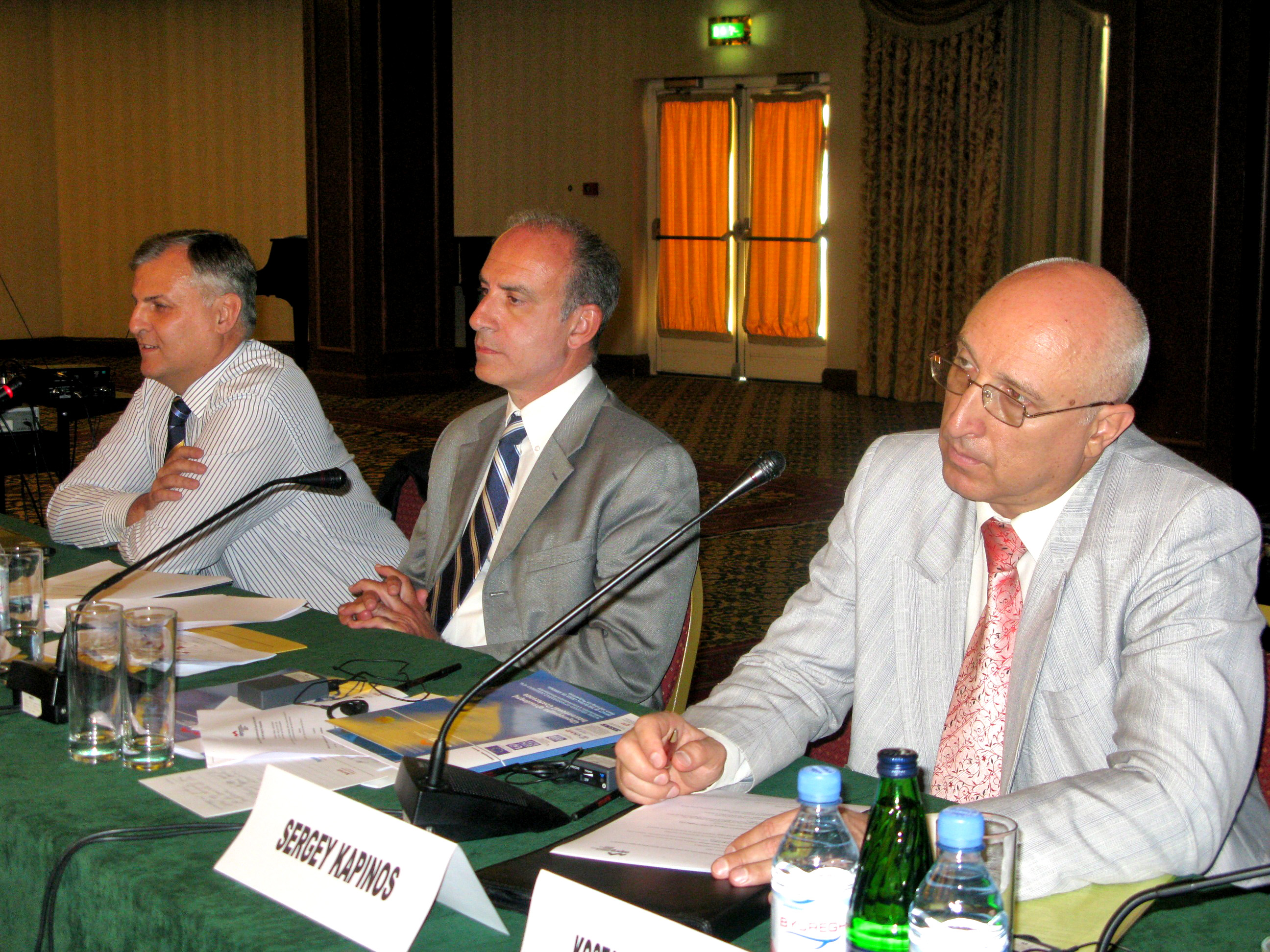 L-r: Raul de Luzenberger, Head of the EC Delegation to Armenia, Aristomene Varoudakis, Head of the World Bank Office in Armenia and Head of the OSCE Office in Yerevan, Ambassador Sergey Kapinos, at a conference on the global economy, Yerevan, 7 July 2009.