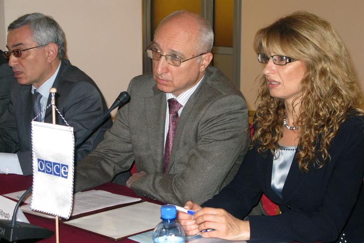 L-r: Simon Papyan, Armenian Deputy Minister of Nature Protection, Amb. Sergey Kapinos, Head of the OSCE Office in Yerevan, and Gohar Ghazinyan, Environmental Programmes Officer at the OSCE Office in Yerevan, at a conference on global climate challenges.