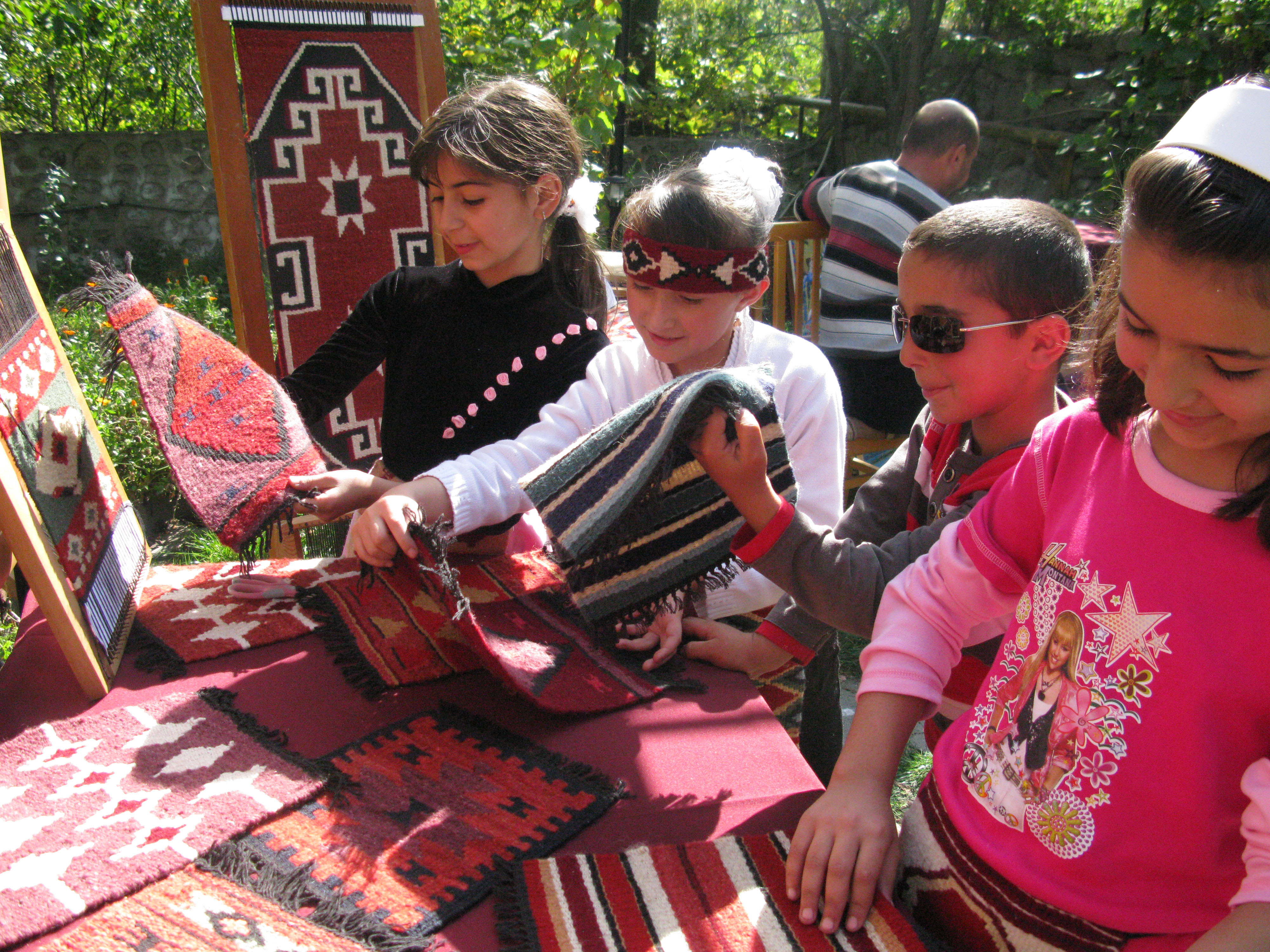 Children looking at hand-woven rugs at an arts and craft fair organized to enhance female entrepreneurs' business skills, Goris, Armenia, 17 October 2009.
