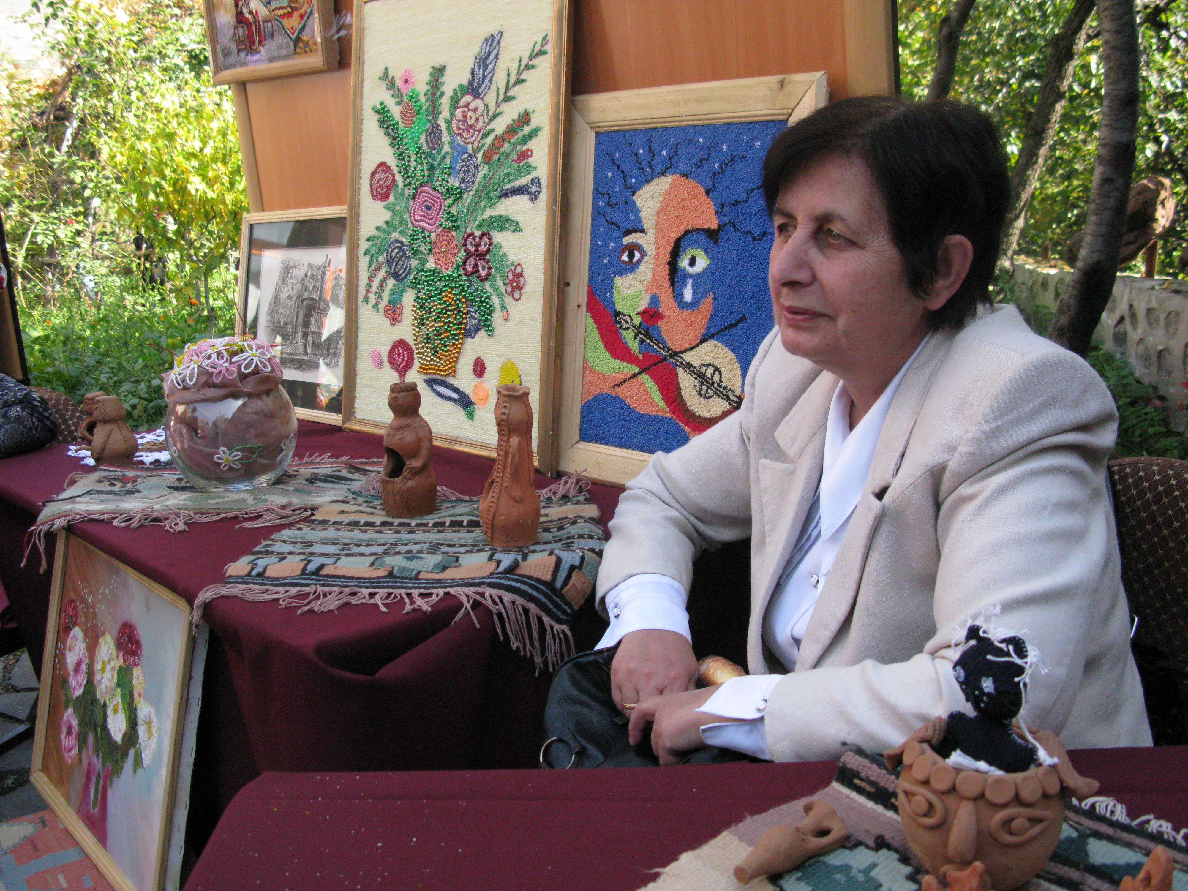A woman sits by her stall at an arts and craft fair featuring works produced by women from the Syunik region, Goris, Armenia, 17 October 2009.