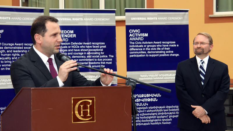 United Nations Resident Coordinator Bradley Busetto (l) presents the “Local Government Reformer” award to the Head of the Karahunj community Lusine Avetyan (r) in recognition of her outstanding leadership of the people of Karahunj, which made the community a better place to live.