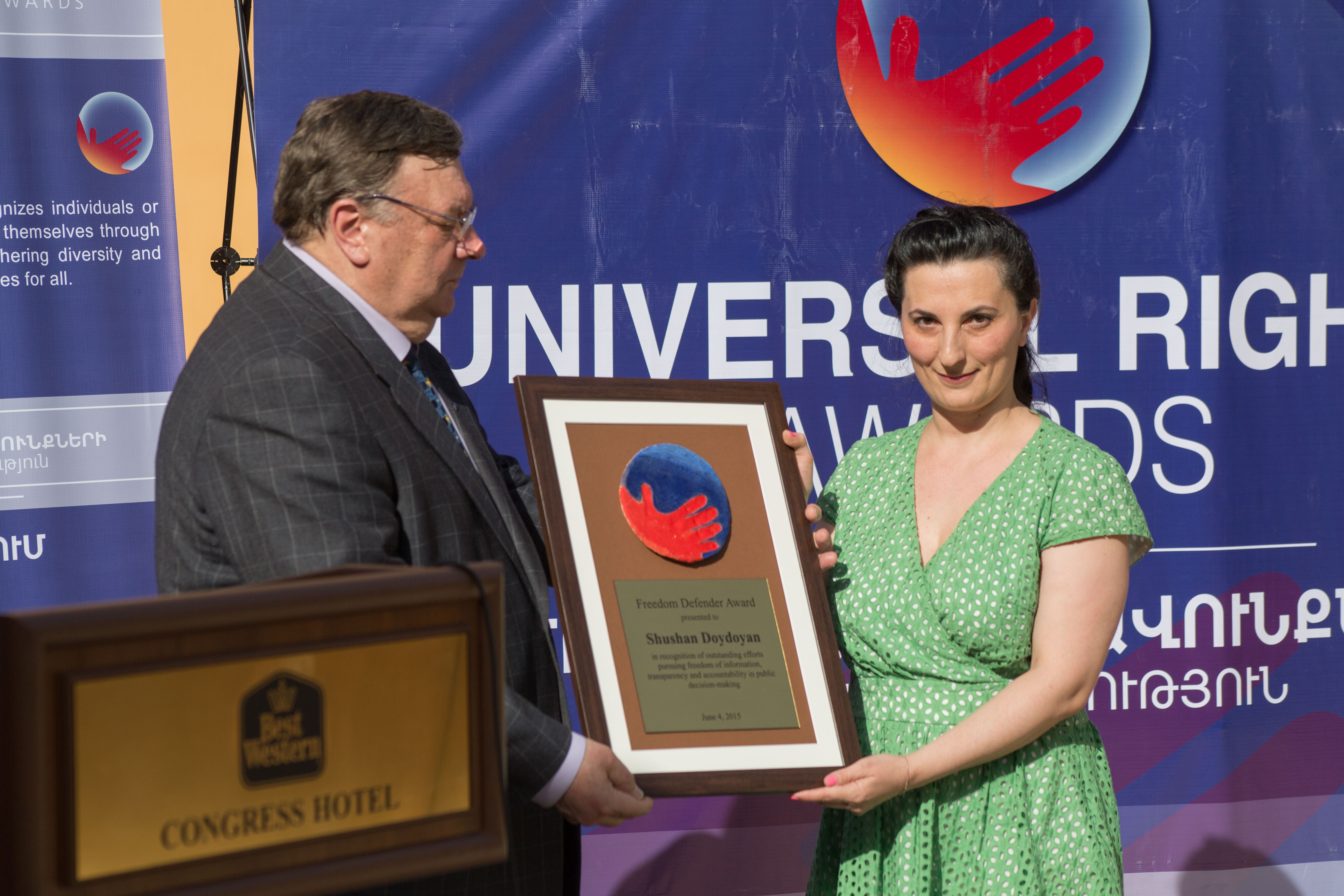 Shushan Doydoyan (r), President of the Freedom of Information Centre in Armenia, receives Freedom Defender award from Ambassador Andrey Sorokin (l), Head of the OSCE Office in Yerevan, at the Universal Rights Awards Ceremony in Yerevan, 4 June 2015.