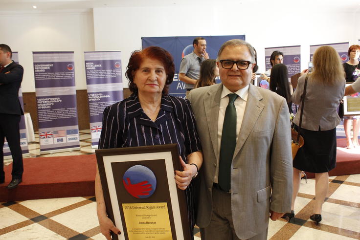 Ambassador Argo Avakov, the Head of the OSCE Office in Yerevan presenting a Woman of Courage award to Jemma Hasratyan, President of the Association of Women with University Education at the Universal Rights Award Ceremony, Yerevan, 23 June 2016.