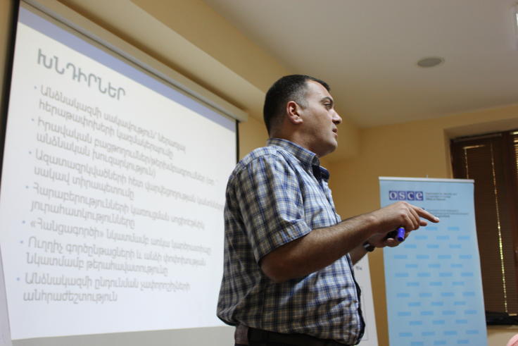 Arshak Gasparyan, human rights expert, conducts a session on protection of human rights in penitentiaries during an OSCE-supported training course held in Aghveran, Armenia, 12 September 2016.