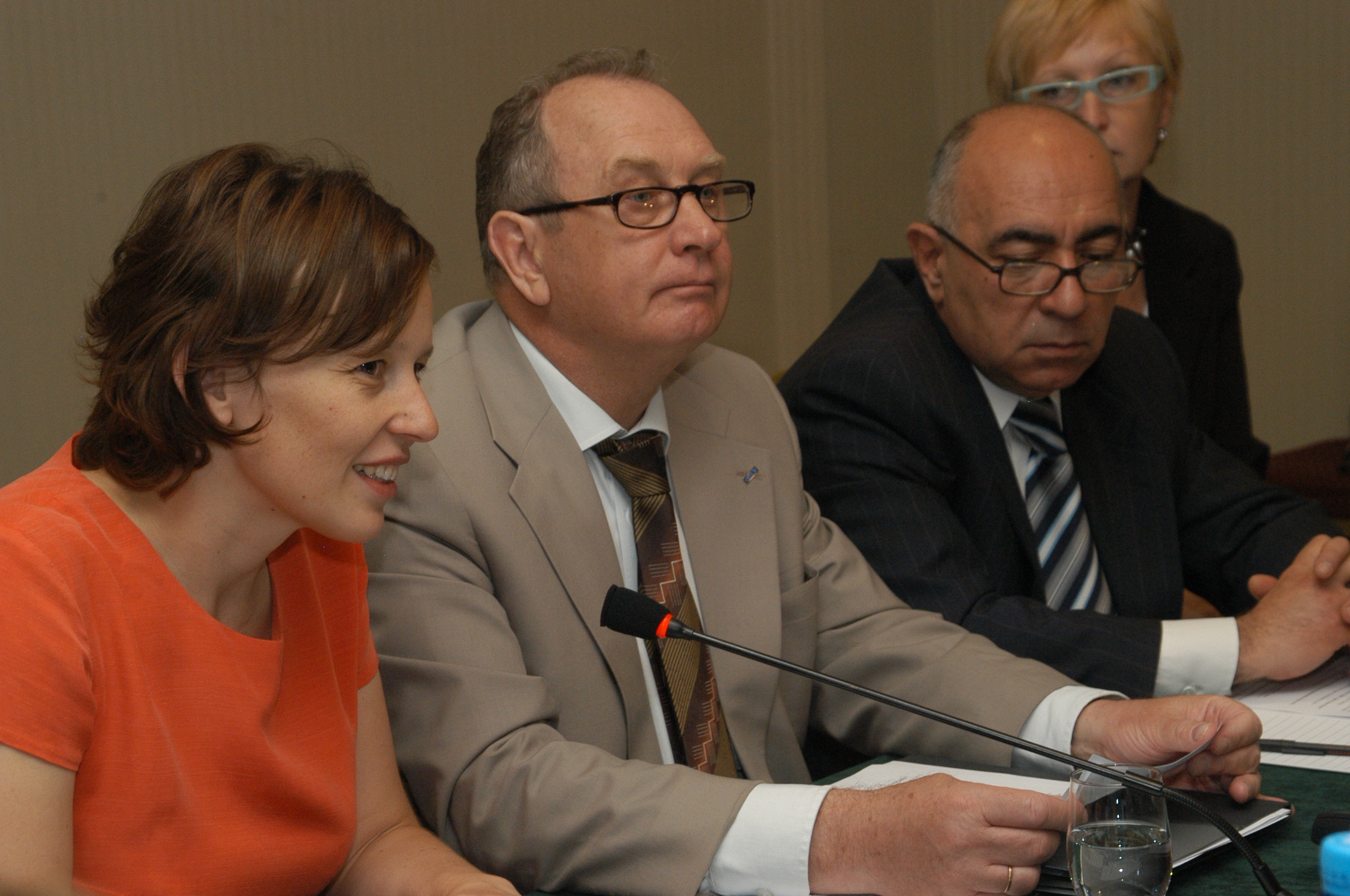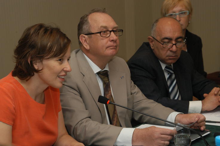Democratization Officer Blanka Hancilova (l.), OSCE Office in Yerevan Head Vladimir Pryakhin (c.), and Chairman of the Armenian Inter-Agency Commission on Anti-Trafficking Issues, Valery Mkrtumyan, at a meeting in Yerevan, 9 June 2006.