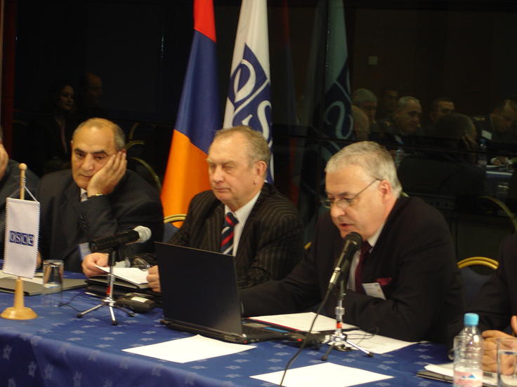 Head of the OSCE Office in Yerevan, Amb. Vladimir Pryakhin (c), and Head of the Armenian Police, Colonel-General Haik Harutyunyan (l), listen to OSCE Senior Police Adviser, Kevin Carty, address a seminar on community policing in Armenia, 30 October 2006.