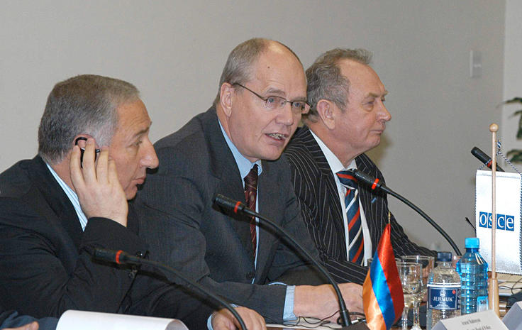Goran Lennmarker (centre), President of the OSCE Parliamentary Assembly, with Ambassador Vladimir Pryakhin (right), Head of the OSCE Office in Yerevan, and Ararat Mahtesyan, First Deputy Head of the Armenian Police, in Yerevan, 5 February 2007.