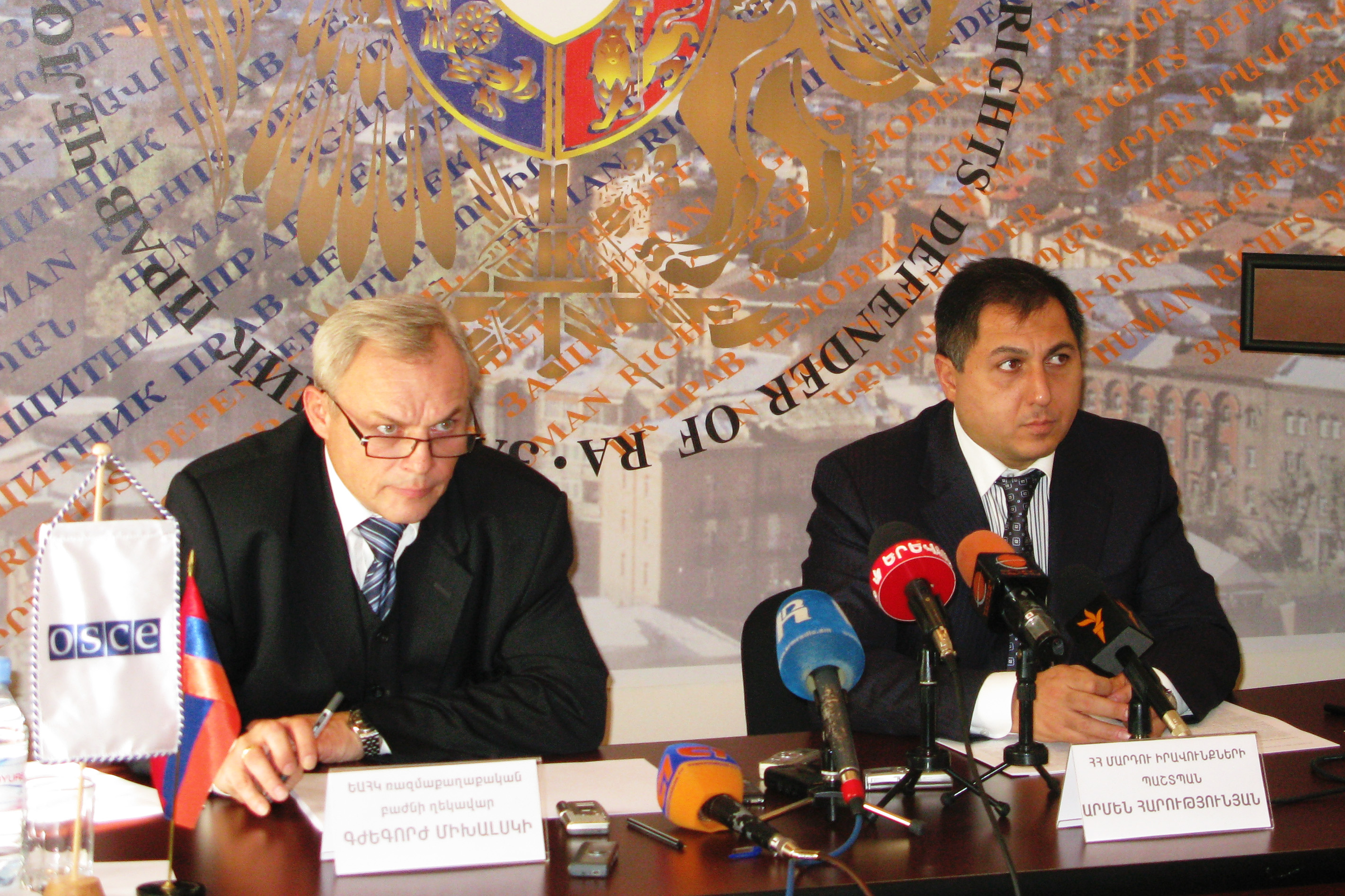 Grzegorz Michalski (l), Politico-Military Officer at the OSCE Office in Yerevan with the Armenian Ombudsman Amen Harutyunyan, at the presentation of an OSCE-supported survey on human rights in Armenia's armed forces, Yerevan, 28 October 2010.
