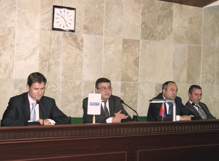L-r: Deputy Head of the OSCE Office in Yerevan Carel Hofstra, Vice-Rector of Yerevan State University Aleksandr Grigoryan, Civil Service Council Chairman Manvel Badalyan and Union of Government Employees Chairman Vache Kalashyan, Yerevan, 9 November 2010.