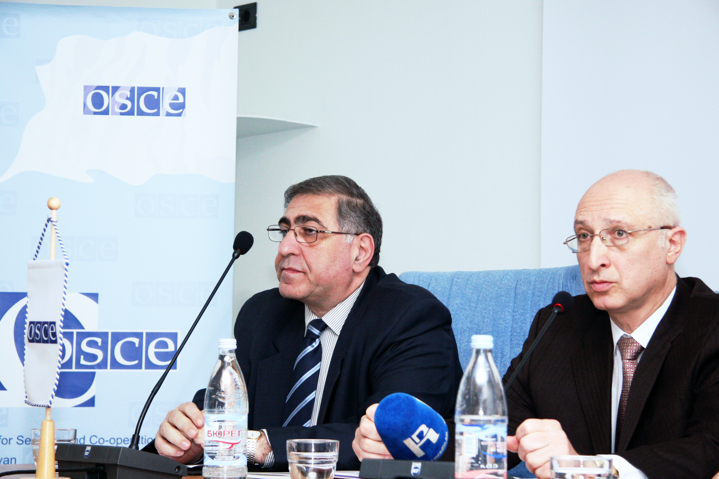 Ambassador Sergey Kapinos (r), Head of the OSCE Office in Yerevan and Arman Kirakossian, Armenian Deputy Minister of Foreign Affairs, presenting the anniversary publication of three OSCE documents to the public, Yerevan, 22 December 2010.