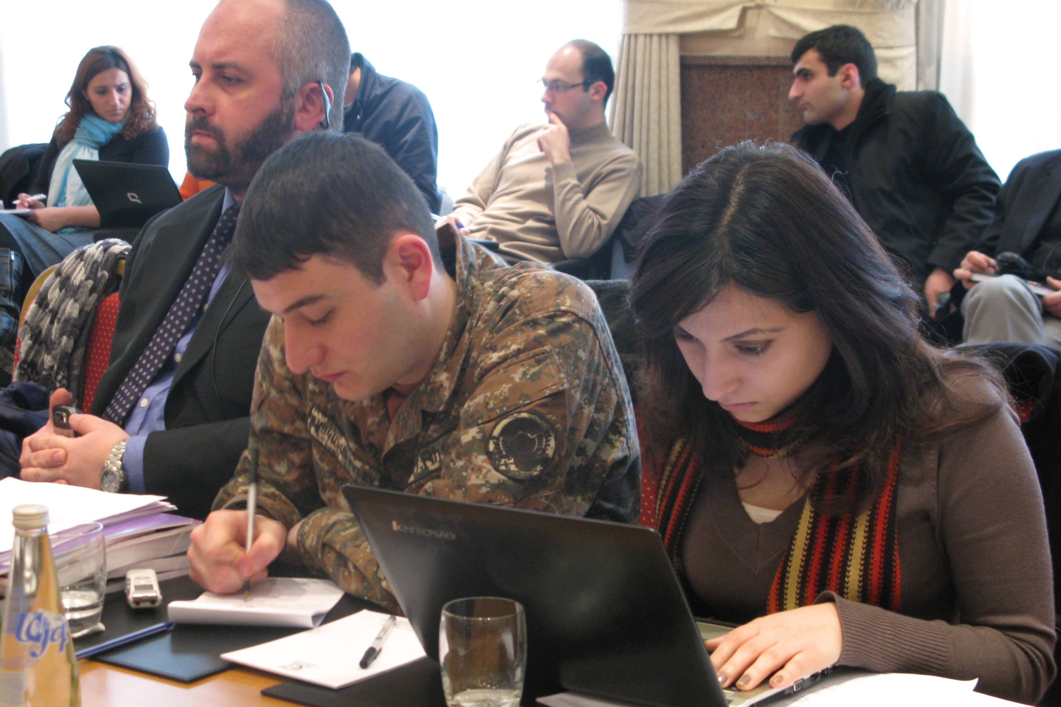 Participants at an OSCE-supported discussion on international best practices for democratic control of the armed forces and human rights protection in the military in Armenia, Yerevan, 22 February 2011.