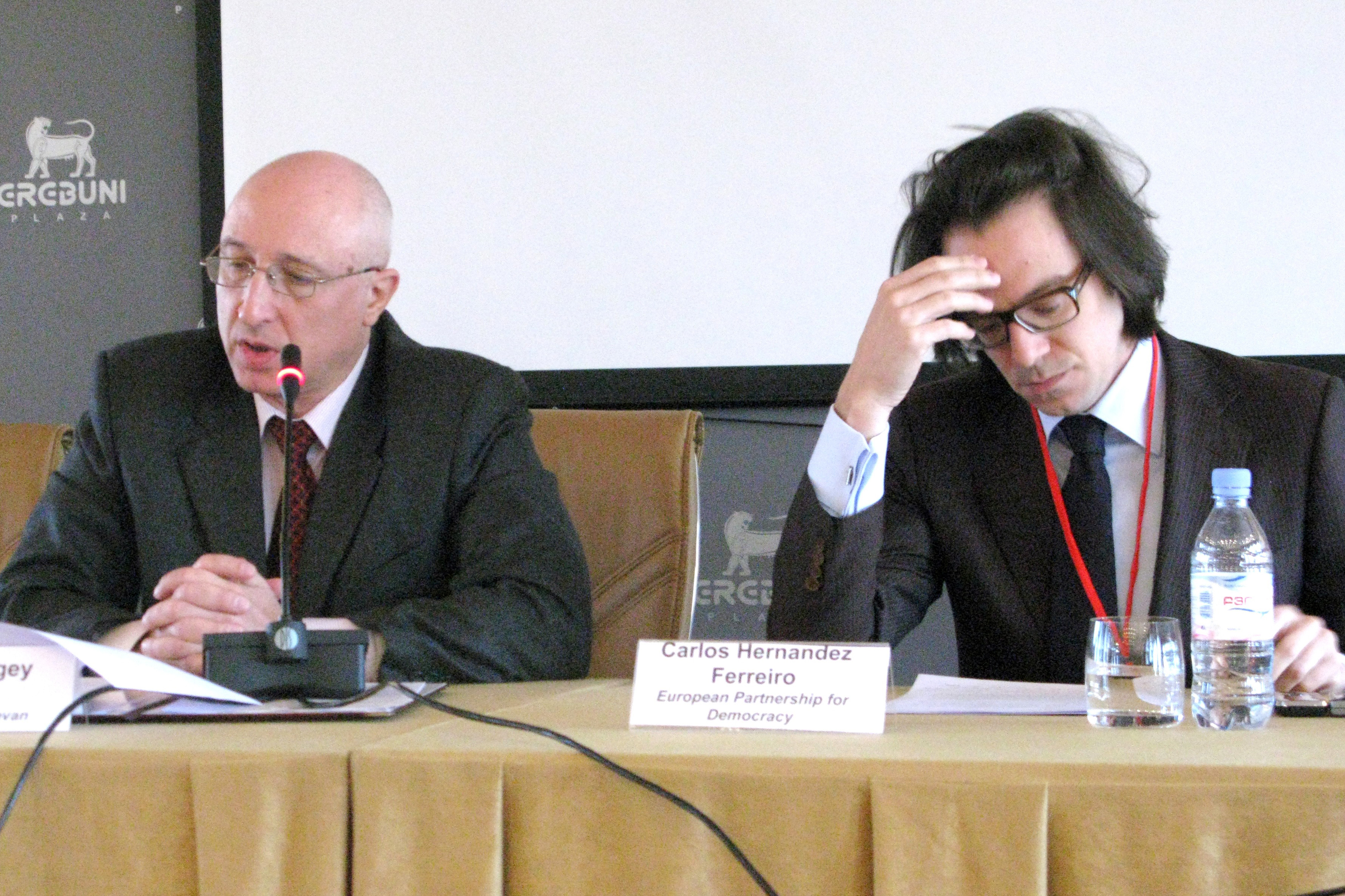 The Head of the OSCE Yerevan Office Ambassador Sergey Kapinos (l) and Executive Director of European Partnership for Democracy Carlos Hernandes Ferreiro, at an OSCE-supported conference on promoting contact between Armenian and European civil society groups, Yerevan, 14 April 2011.