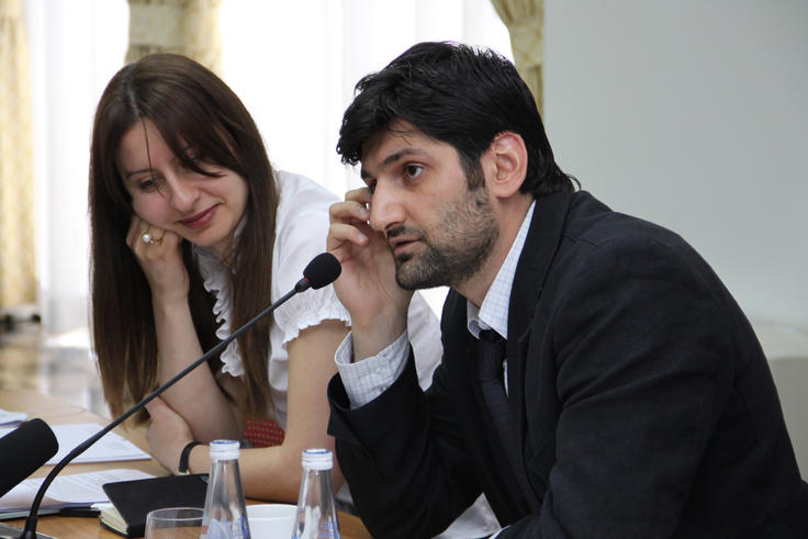 Lousineh Hakobyan, President of Europe in Law Association and Vahe Grigoryan, lawyer, ELA, Head of the Commission for the Analysis of the Case Law of the European Court of Human Rights of the Chamber of Advocates of Armenia, discuss freedom of expression legal issues with Armenian journalists, 16 June 2011.