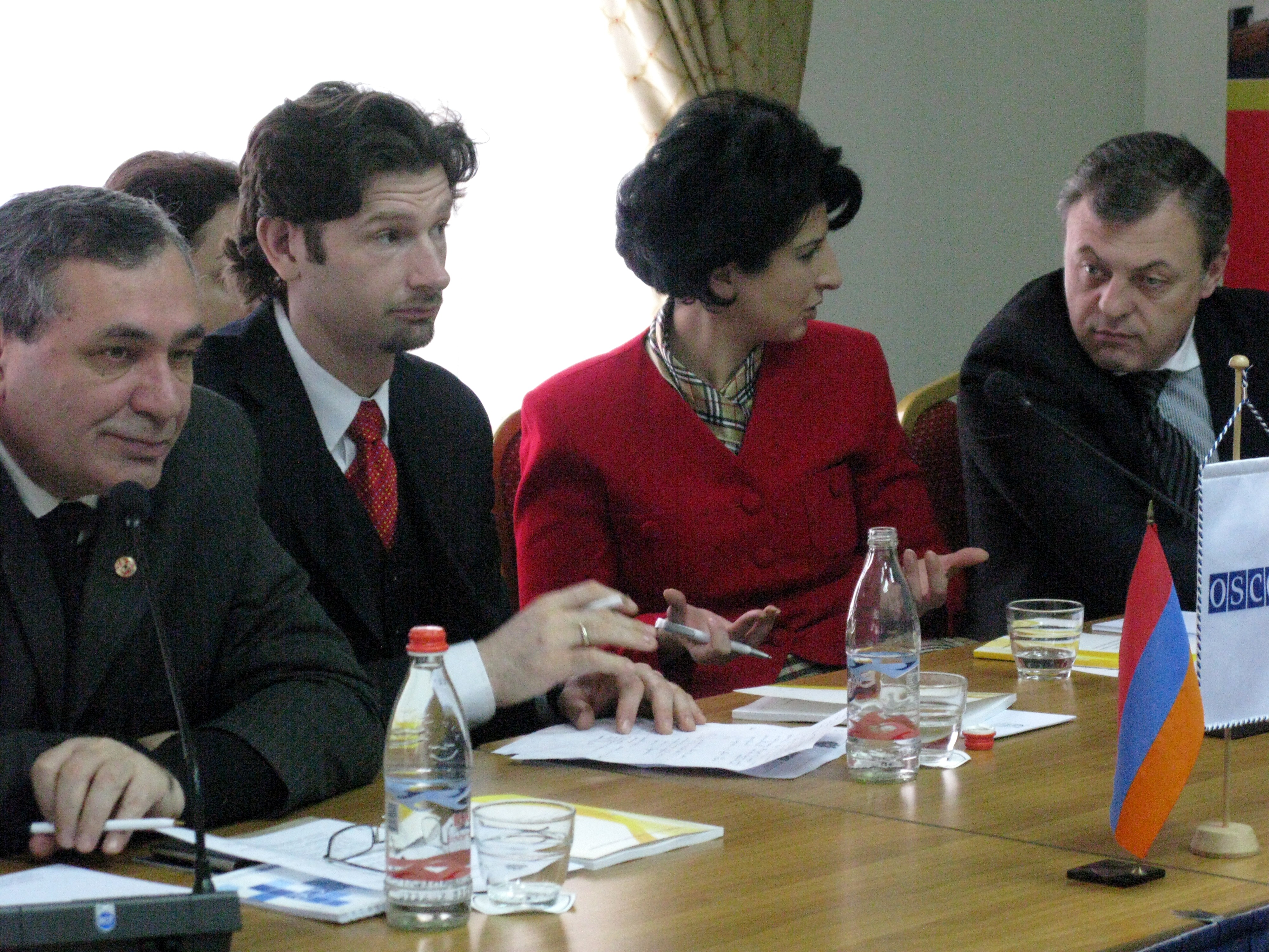 L-r: Filaret Berikyan, Chairperson of the Inter-Institutional Commission for Combating Gender-based Violence, Deputy Minister of Social and labour issues; Oliver McCoy, OSCE Yerevan Office Democratization Programme Manager; Shoghik Sargsyan from the OSCE Office in Yerevan and Lilian Salaru, OSCE Yerevan Office Politico-Military Programme Manager, Yerevan, 17 February 2012.