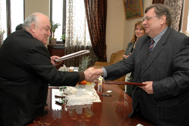 The Head of the OSCE Office in Yerevan, Ambassador Andrey Sorokin (r) and Rector of the Yerevan State University, Aram Simonyan, signing a memorandum of understanding on establishing a Sustainable Development Centre in Yerevan State University, Yerevan, 2 March 2012.