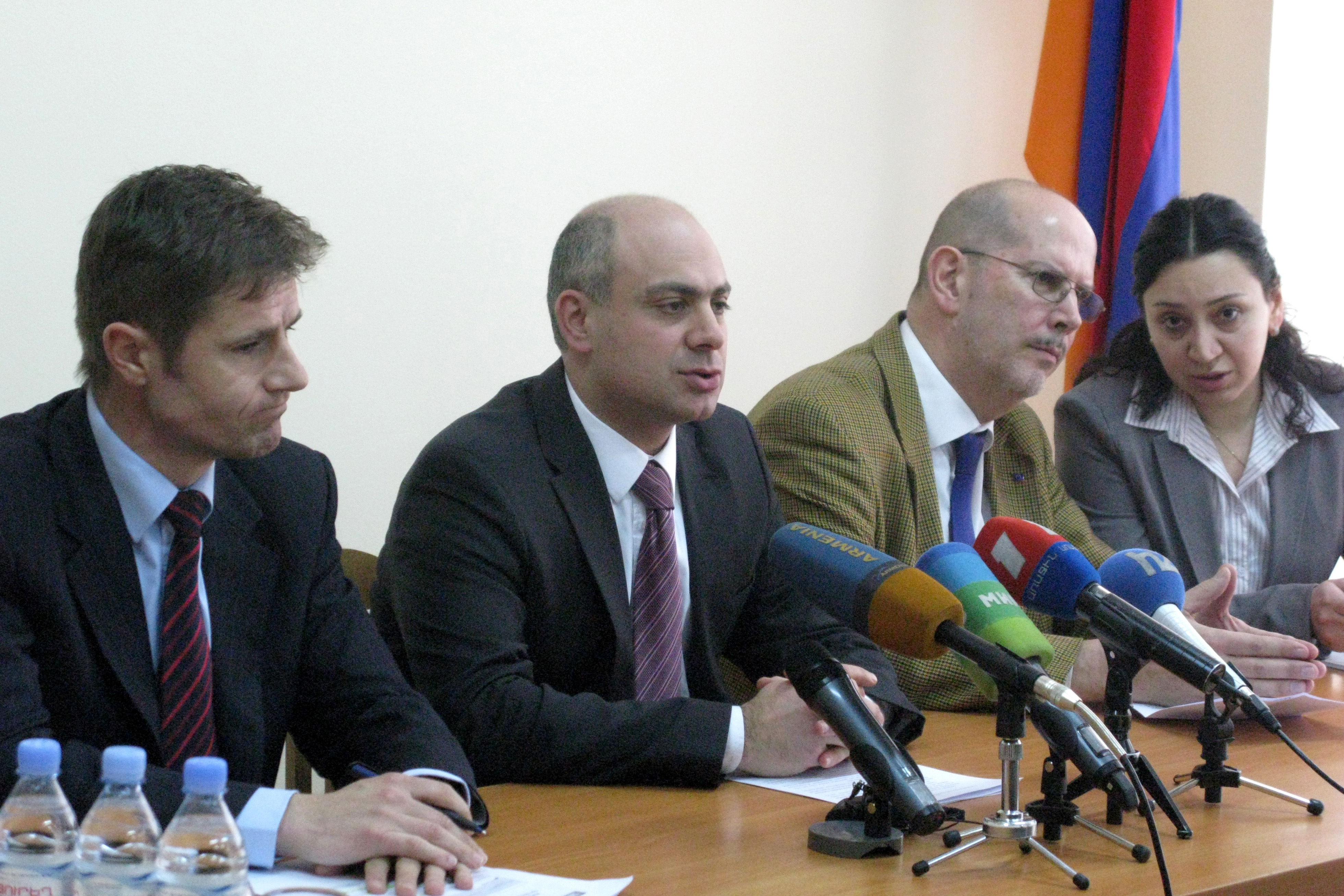 L-r Deputy Head of the OSCE Office in Yerevan, Carel Hofstra; Deputy Head of the Armenian Police, Major-General Artur Osikyan; Onno Simons, First Counsellor of the EU Delegation in Armenia, and Naira Baghdasaryan from the OSCE Office in Yerevan, at the signing of a handover agreement of equipment to the police, Yerevan, 29 March 2012.