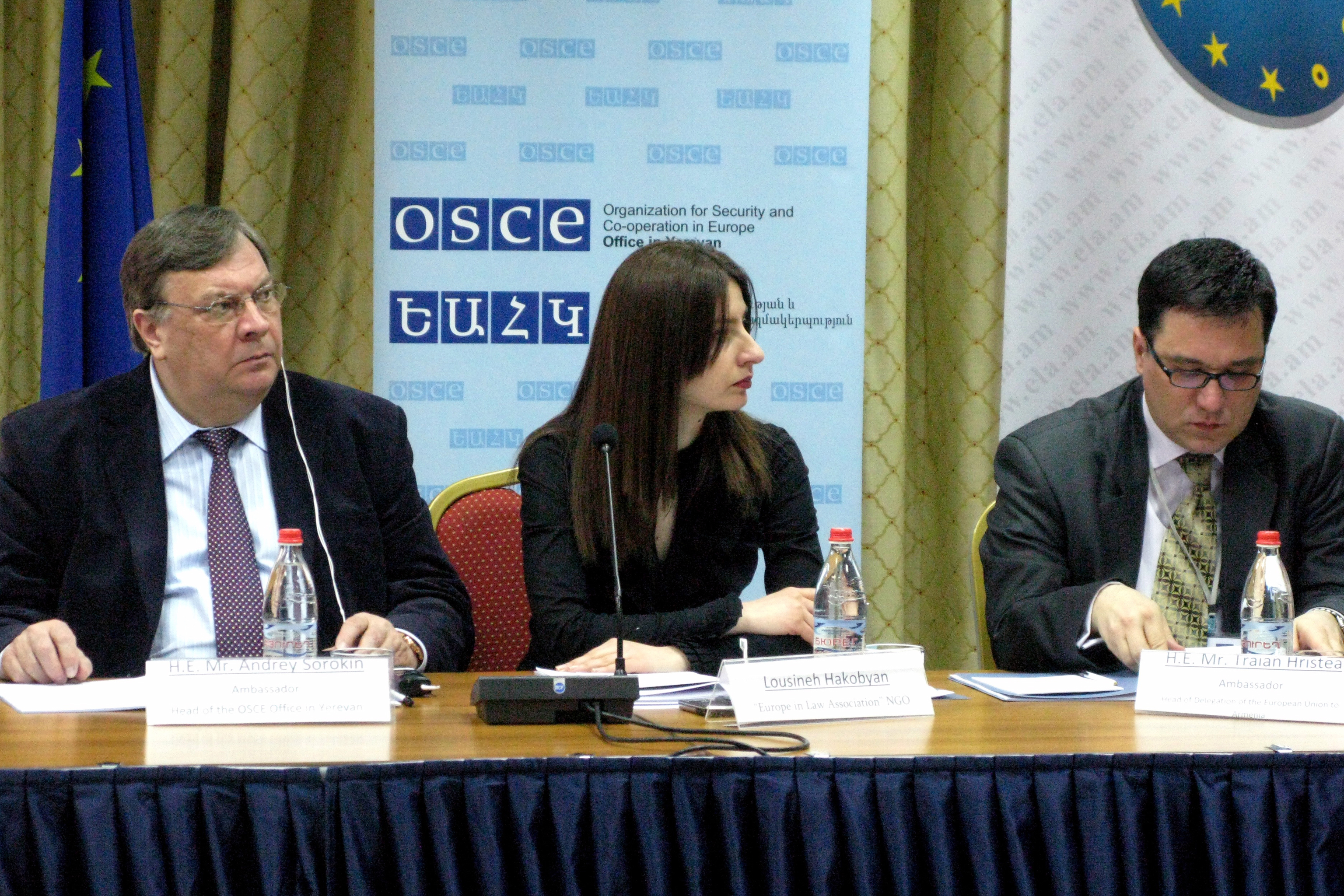 L-r: Head of the OSCE Office in Yerevan Ambassador Andrey Sorokin, President of Europe in Law Association Lousineh Hakobyan and the Head of Delegation of the European Union Traian Hrist launch a workshop for media representatives on responsible, accurate and balanced reporting on elections, Yerevan, 2 April 2012.