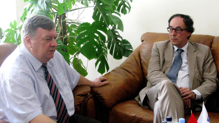 The Head of the OSCE Office in Yerevan Ambassador Andrey Sorokin (l),and Ambassador Pieter Jan Langenberg of the Embassy of the Netherlands discuss joint efforts to strengthen women’s political participation, Yerevan, 25 July 2012.