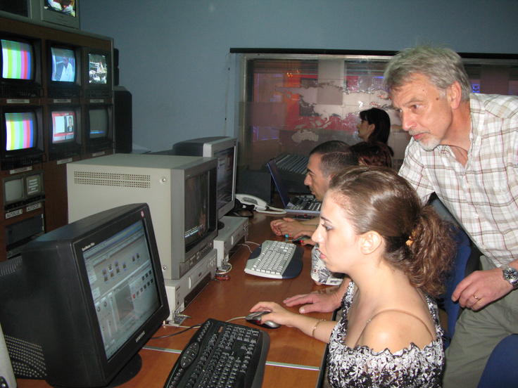 Richard Lucas (right), consultant from BBC World Service Trust, talks to the staff of Armenian Public TV as part of a needs assessment mission on 14-18 July 2008 supported by the OSCE Office in Yerevan.
